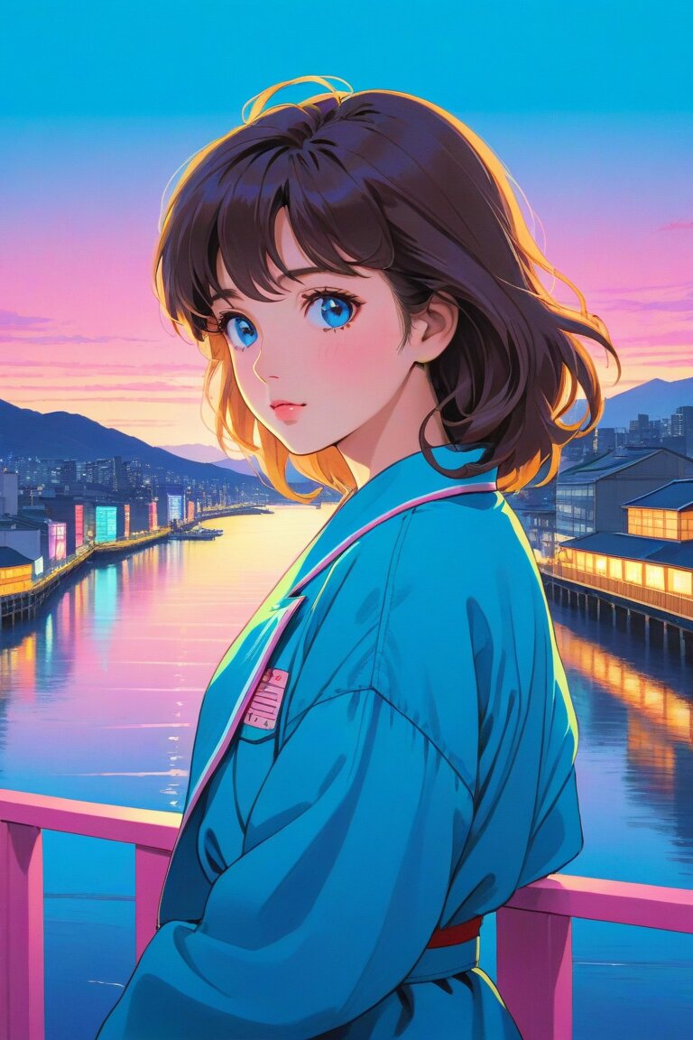 masterpiece, best quality, beautiful detailed eyes, ultra-detailed, finely detail, highres, perfect anatomy, colorful, Pastel Colors, (1girl:1.5), solo, city pop illustration, (city pop arts), simple background, retro style, (vaporwave city pop), (80's city pop:1.5), (city pop anime), (pier, river, bridge), retoro style, Kyoto Animation, 80's fashion, cowboy shot