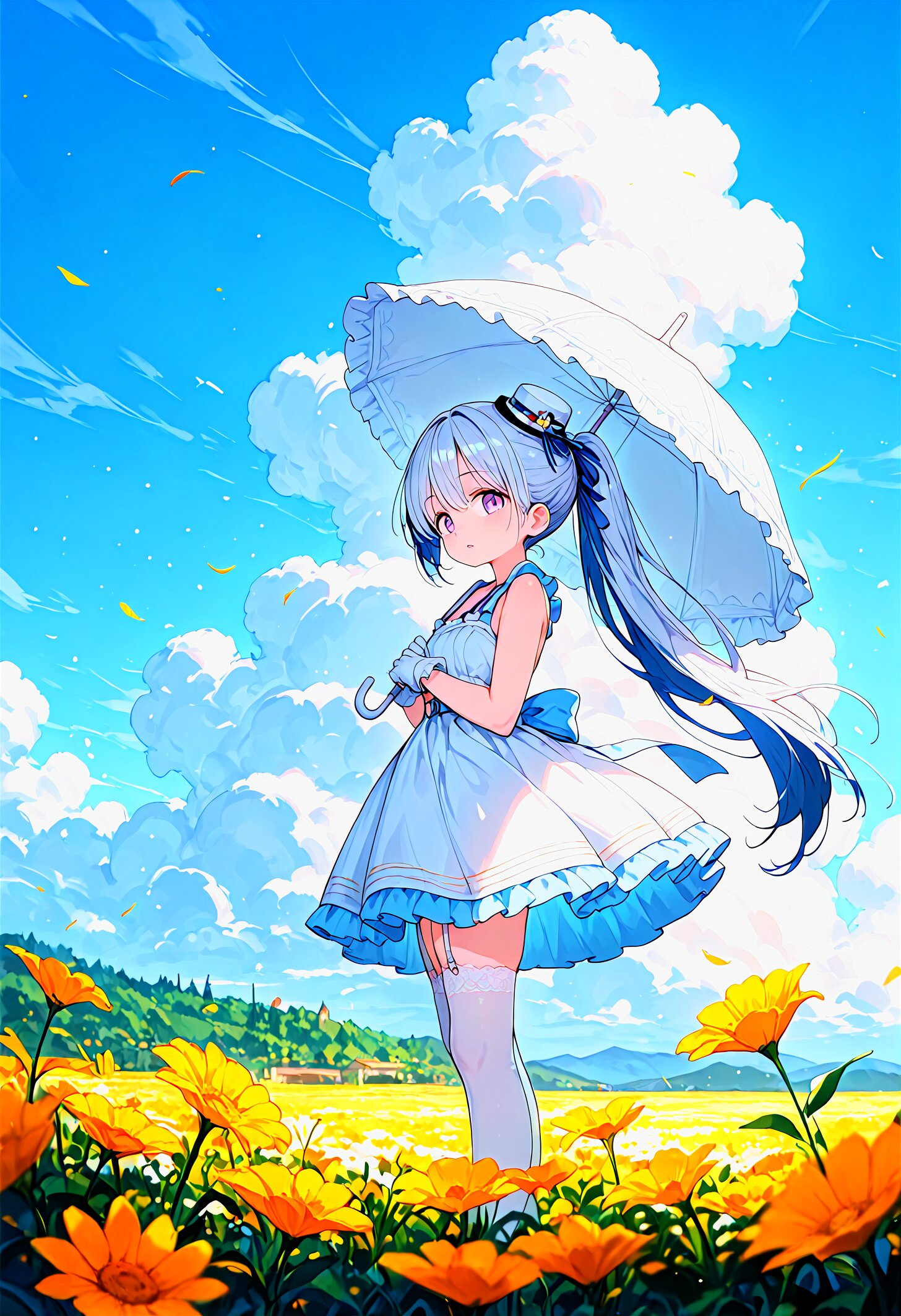 amazing quality,best quality,ultra-detailed, beautiful detailed background, best quality,, (depth of field:0.8), (noon:1.2), clear, scenery, detailed, intricate, solo, (wide shot,:1.3) (blue sky,:1.1) cloudy sky, , parted lips,(Expressionless:0.8), big eyes,(half-closed eyes:0.8), tareme, pale purple eyes, thighhighs, (silver hair:1.1), (dark blue hair colored inner hair:0.8), long hair,very long hair,ponytail, parasol,, holding,holding parasol,, white parasol, mini hat, frills, strapping ribbon, white and blue casual dress, white gloves, gloves, looking at viewer, peeking, standing, wind, garter straps, sun flower field,, (profile:0.7), <lora:noline-16oa:-1.0> <lora:sdxl2-flat2-512b:-1.3>