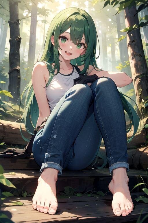 green hair, very long hair, green eyes, gloves, barefoot, (long toes:1.3), (long jeans:1.4),smile,open mouth, forest background