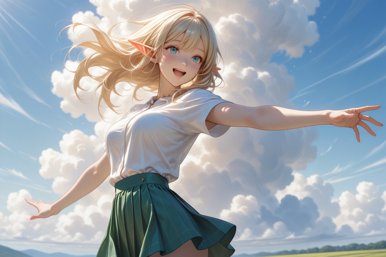 (outdoors, 1girl, solo), sfw:1.2, nice hand, perfect hand, headshot, from side, low angle, (close-up eyes, face focus), BREAK, A elf girl spread arms dancing still on a promenade lined with lush green trees. wearing a summer shirt, mini skirt. She gazes thoughtfully at the serene landscape, as if absorbing the beauty of the world around her. Summer sunshine and large cumulonimbus clouds. surrounded by the vivid greens and blues of summer. BREAK, ultra detailed lips, ultra detailed face and hair, ((Swaying in the wind)), kawaii, adorable, cute, elf girl, (apatite eyes with CGI effect), (deep blonde hair:1.2), medium breasts, wide hip, open mouth big smile, BREAK, volumetric lighting, <lora:elf-san alpha1:0.7> <lora:elf-san alpha4(IL1.0):0.7>,, source_anime, masterpiece, amazing quality, very aesthetic, high resolution, ultra-detailed, 2d, semi-realistic, moe heroine, sharp focus,, anime style, anime color, anime artwork, anime, cel anime, flat color,