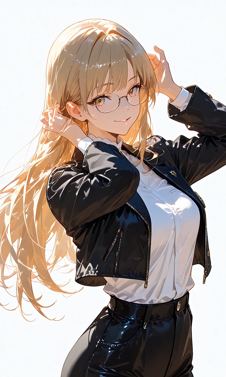 1 lady, long hair, blonde hair, glasses, breasts,(black jacket, white shirt, black pants), cowboy shot, smile