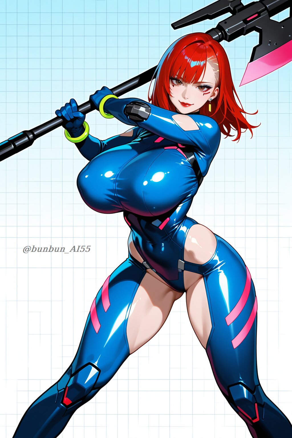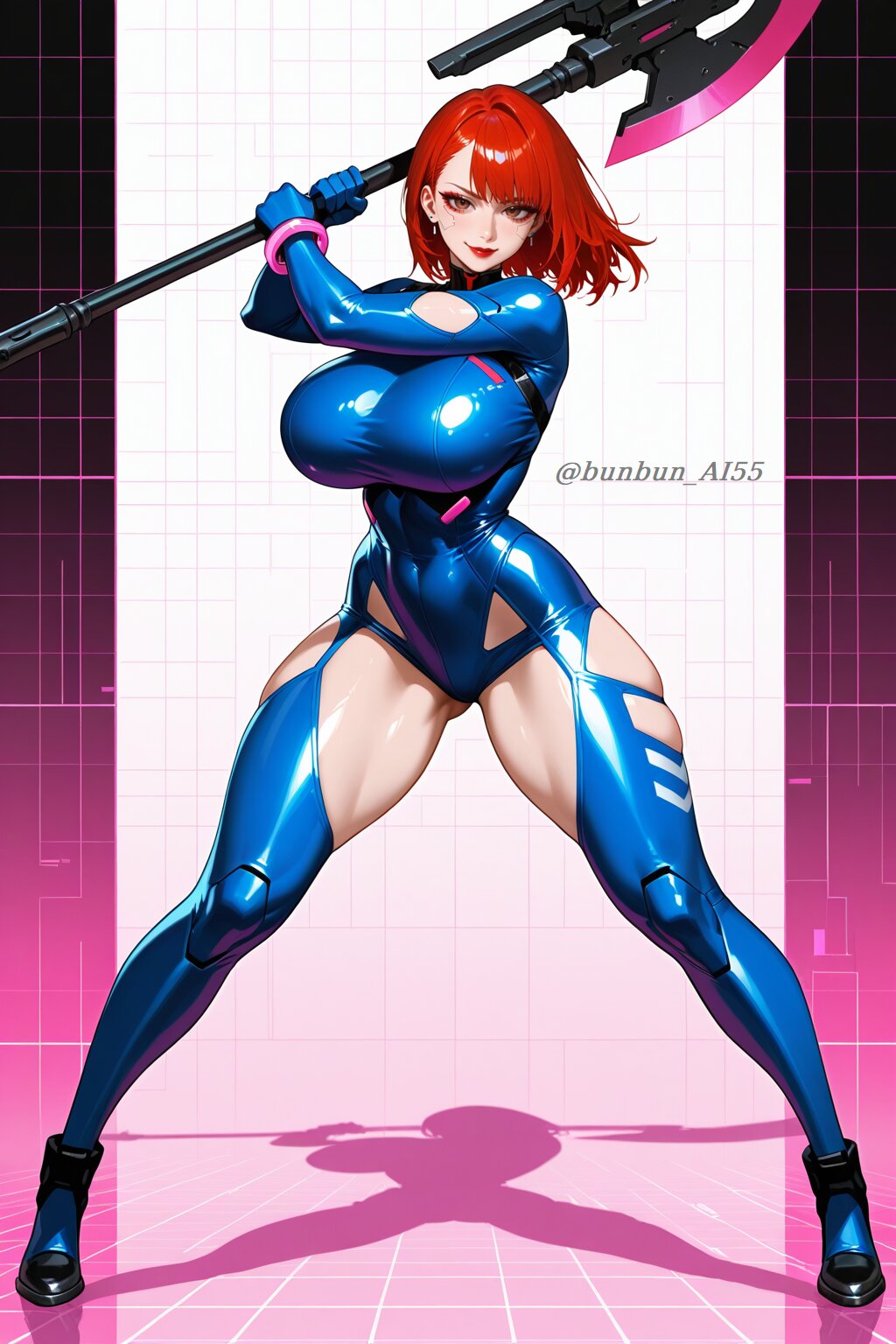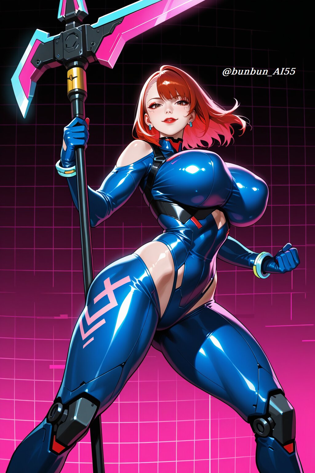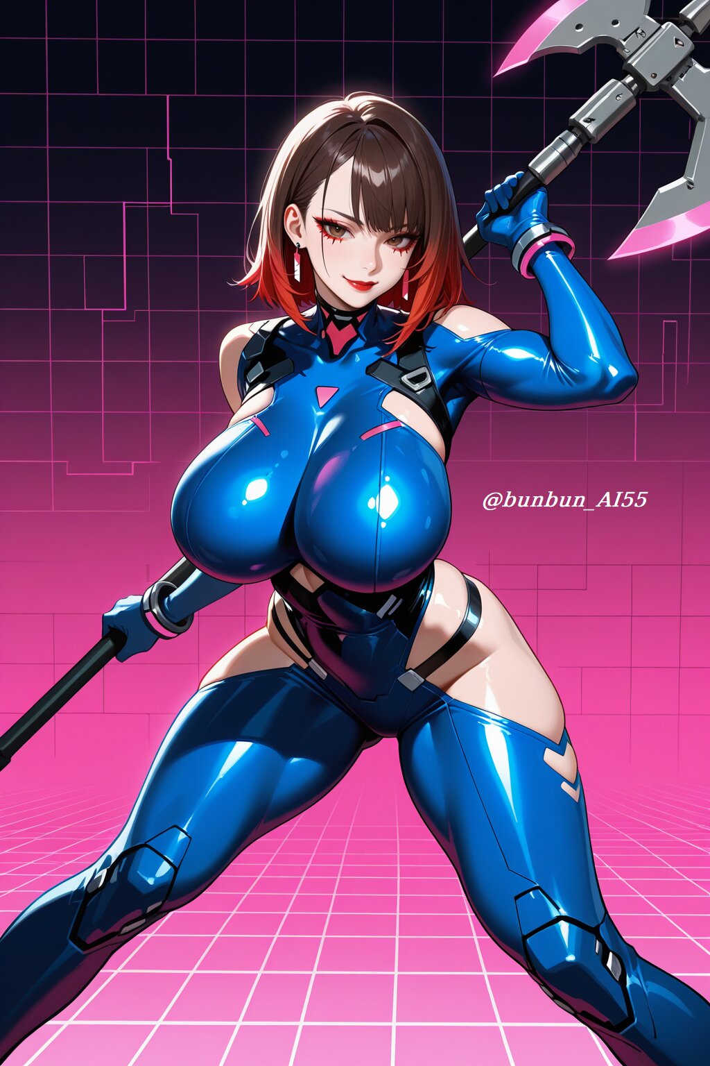 HDR, 8K,masterpiece, best quality, amazing quality, very awa, very aesthetic, absurdres, newest, detailed eyes, realistic eyes, realistic body, highres, add detail, sharp detailes, sharp lines, sharp focus, (realistic, hyperrealistic), sexy style, perfect anatomy, intricate details, high detail RAW color art, high contrast, digital painting, illustration style, depth of field, (mechanical, futuristic, cyberpunk) theme, an intricate illustration, BREAK perfect lighting, professional lighting, face lighting, (1girl, elegant beautiful girl:1.5, 22year old), (serious, sexy, model, cool beauty), (beautiful face, slim face, small face, cute face, detailed face, brown eyes, cyberpunk makeup, red lips), (looking at viewer, alluring gaze, seductive smile), BREAK nsfw, (pink medium hair with red highlights), (jewelry, piercing, earrings, bracelet), (huge breasts, pointy breasts), (long legs, thick thighs), (perfect hands), (shiny skin, glossy skin), (super model body:1.2, muscle body:1.2, slim body, athletic body:1.2), BREAK (wearing a sleek blue futuristic-style bodysuit with neon pink lines, arms cutout, body cutout, thighs cutout, legs cutout, clothing cutout:1.3, intricate design:1.2, Mechanical Designs:1.2), (blue latex gloves:1.2), (light reflections), (shiny, glossy, luster, latex), (tight fit), BREAK (standing, legs apart, holding a huge mechanical halberd, dynamic pose, dynamic action pose, ready for battle pose, heroic pose, fighting pose:1.3), (cyberpunk geometric pattern, glitch background, digital grid), (face focus shot:1.3, medium shot:1.2, dynamic angle),