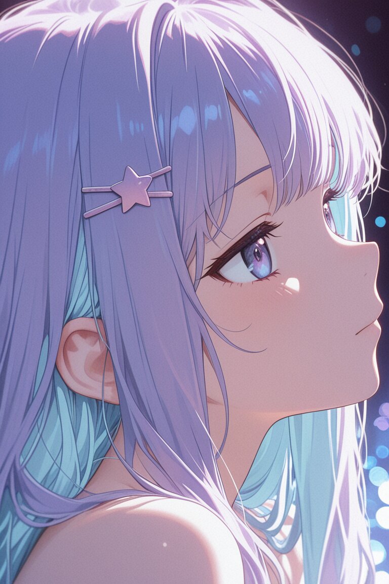 soft anime face, teenage, pastel purple hair, (light blue inner hair:1.3), fluffy long hair, loosely wavy hair, soft flowing hair, straight-cut bangs, star-shaped hairpin, calm violet eyes,, (masterpiece:1.3), (best quality:1.2), dreamy pastel bokeh, soft rim light, crisp anime lineart, soft cell shading, high detail, elegant atmosphere