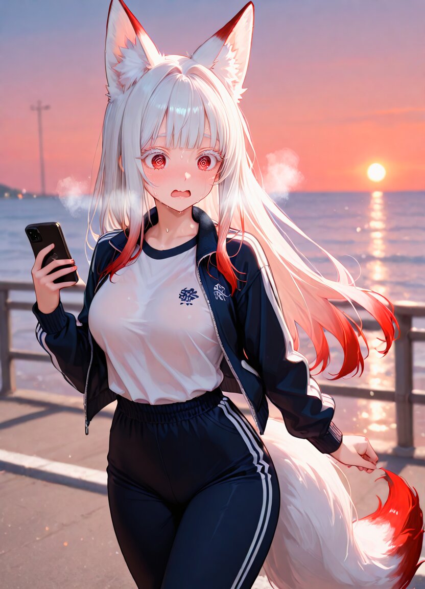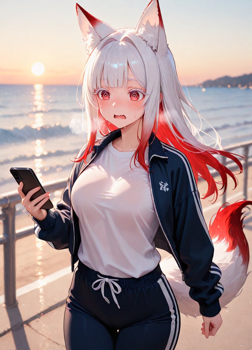 at morning,at street,ocean background, 1girl,solo,sportswear,white t-shirt,long sleeve jacket,long sleeve pants,running,sweat, wavy mouth,tired,open mouth,,spiral eyes,steam,heavy breathing,open jacket, holding smartphone,looking at smartphone, cowboy shot, BREAK 20 years old,medium breasts,(white heir:1.1),blunt bangs,(long hair),(red gradient hair),straight hair,(white fox tail),(red gradient tail),white fox ear,animal ear fluff,tareme,red eyes,(white eyelashes:1.3),cute face,fair skin,red dip-dye hair,hair intakes,, appropriate posture,appropriate configuration,ideal ratio body proportions,perfect anatomy, <lora:Fixhands_anime_bdsqlsz_V1:1>, masterpiece,best quality,newest,absurdres,highres,ultra high res,8K UHD,hyper-detailed,