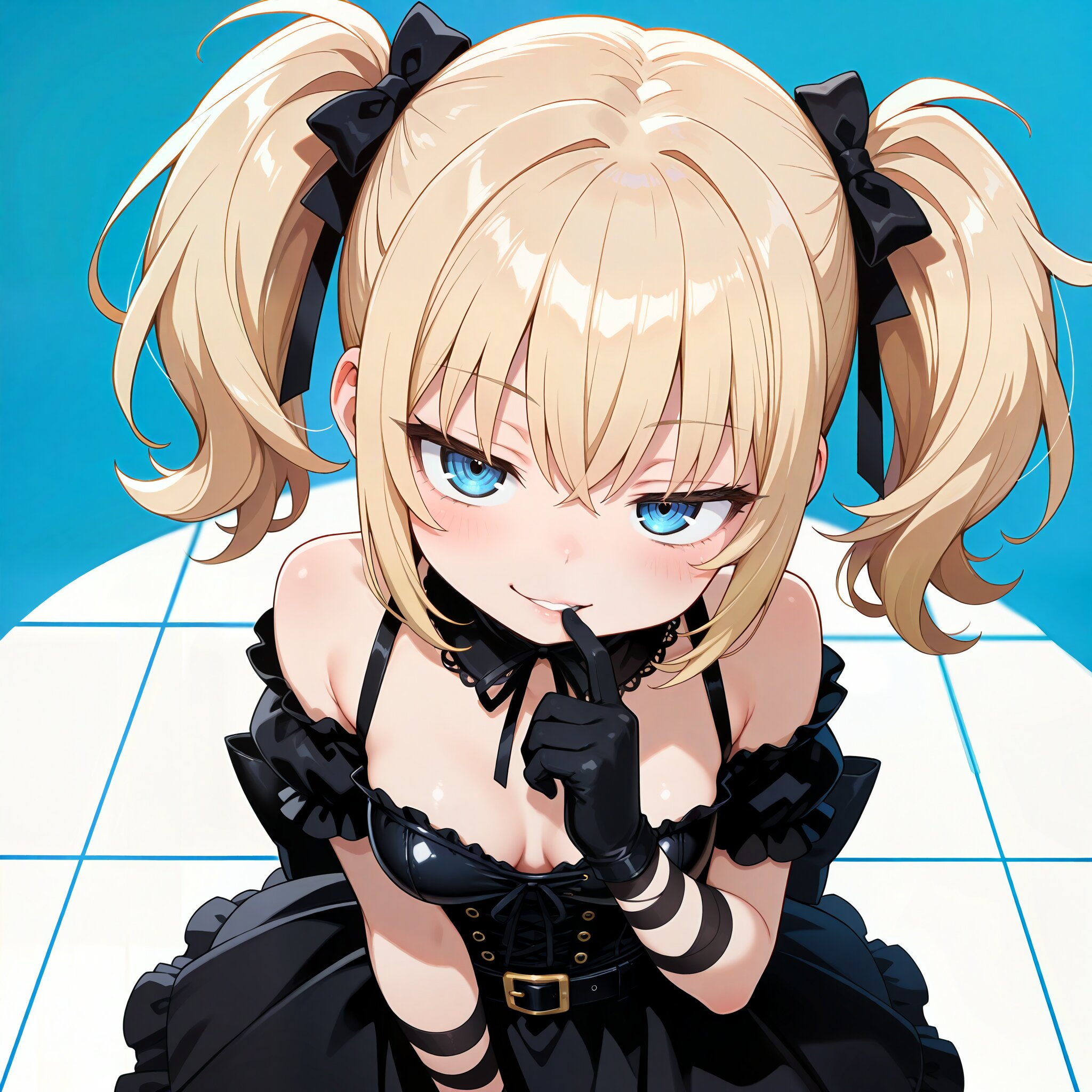 masterpiece, best quality, amazing quality, very aesthetic, absurdres, newest, 4k, surreal atmosphere, ultra detailed, highly detailed, high detail, hyperrealism, high resolution, intricate details, 30%, BREAK mesugaki, Ani_(Grok), loli, medium hair, 0.2::long hair::, twintails, (messy hair:1.1), blonde hair, bangs, blue eyes, sharp eyes, tsurime, (sanpaku:-0.2), jitome, medium breasts, gothic, black leather waist cincher shaped bodice, off-shoulder short dress, corset, belt, back bow, black belt around arm, black bandage wrapped around arms, black gloves, finger on lips, BREAK <lora:Ani_(Grok)_Illustrious_2.0-XL_v2:0.6>, <lora:ZankuroStyleIllustrious_v2:0.5>, <lora:illustriousXL_stabilizer_v1.23:0.3>