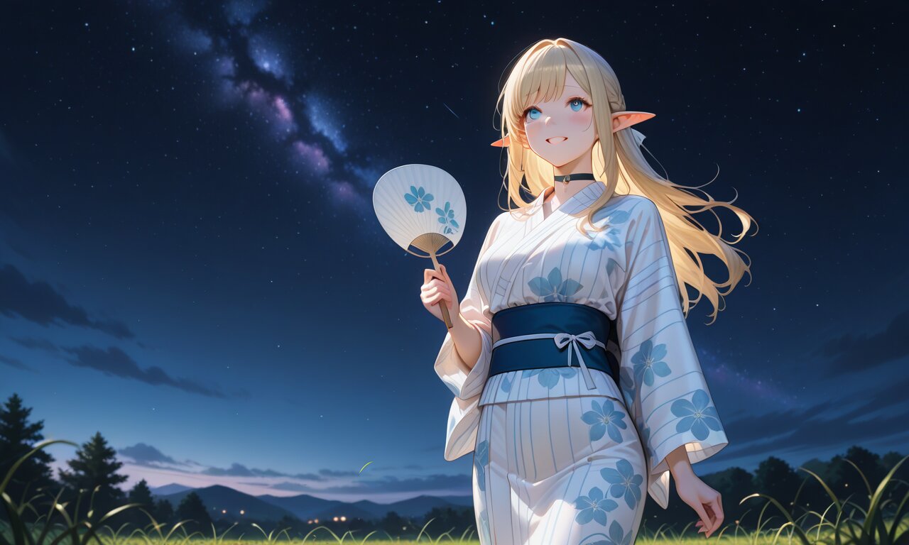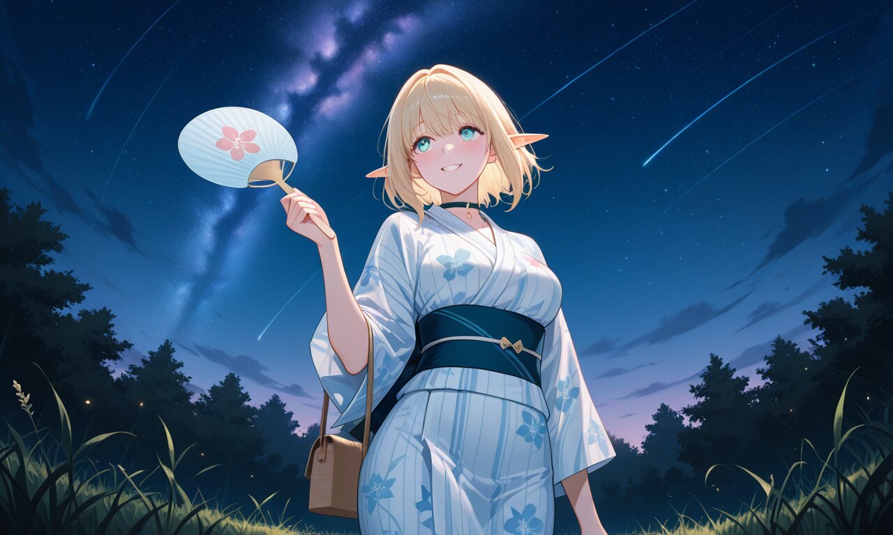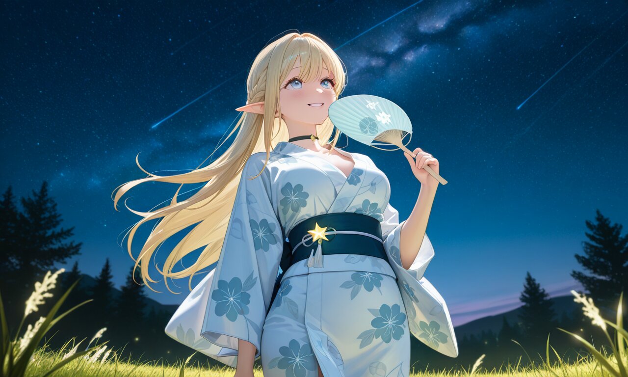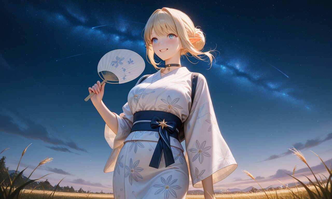 perfect hands, perfect anatomy, perfect structure, (background is lots of shining Stars in the night sky. Quiet grassfield park. Late at night, milkyway), (a girl standing, looking up at night sky with an Embarrassed happy smile), outdoors, 1girl, solo, cowboy shot, low angle, from the front, (She is wearing an pastel colored, sheer, cute yukata), choker, (She has Uchiwa), (Uchiwa is non-folding fan with a handle), ultra detailed lips, ultra detailed face and hair, beautiful eyes, kawaii, adorable, cute, elf girl, (apatite eyes with CGI Effect), (deep blonde hair:1.2), medium breasts, wide hip,, masterpiece, amazing quality, very aesthetic, high resolution, ultra-detailed, absolute, newest, 2d, semi-realistic, moe heroine, sharp focus,