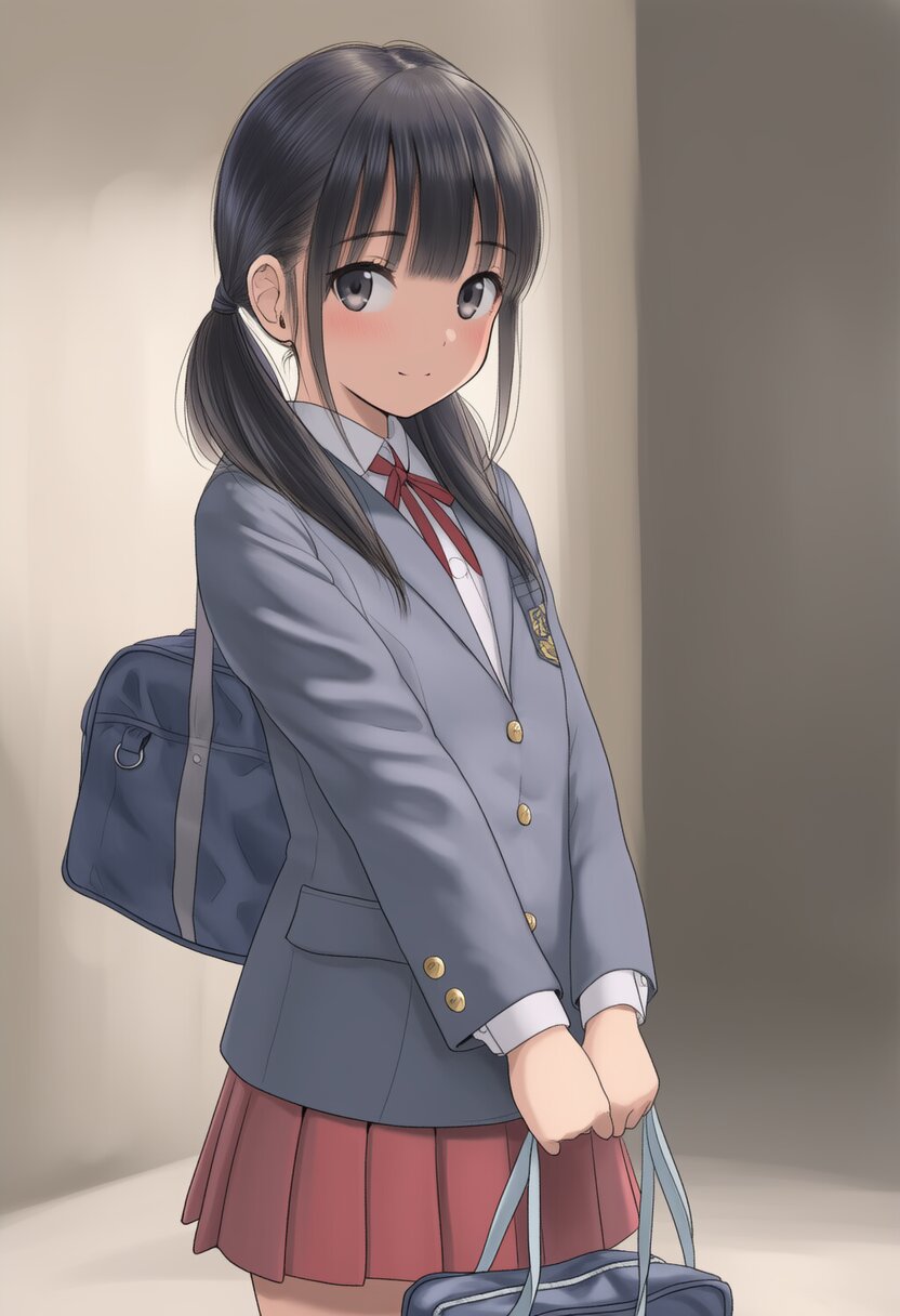 (traditional media:1.5),(sepia:1.8),masterpiece,best quality,ultra detailed,girl,short stature,flat chest,black eyes,{{black hair}},{pigtails},long hair,low twintails,extra long sideburns,blazer,red skirt,ribbon,school bag,light smile,simple background, very aesthetic, masterpiece, no text