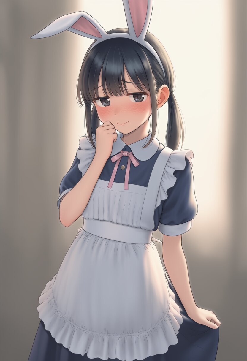 (Traditional Media: 1.5),(Sepia: 1.8),Masterpiece,Highest Quality,Super Detailed,girl,short stature,flat chest,black eyes,{{black hair}},{pigtails},long hair,low twintails,extra long sideburns,Bunny Girl,Bunny ear headband,maid,seductive smile,embarrassed,simple background, very aesthetic, masterpiece, no text
