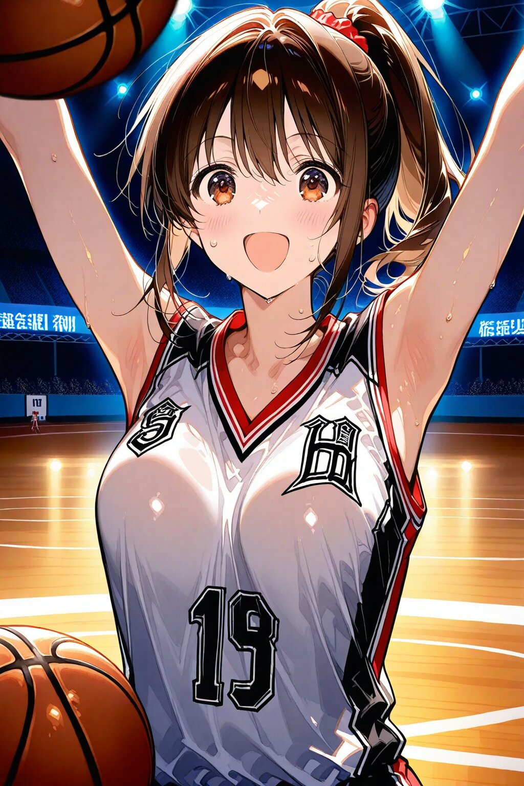 1 lady, brown hair, long ponytail, brown hair, breasts, smile, excited, sweat, basketball uniform,