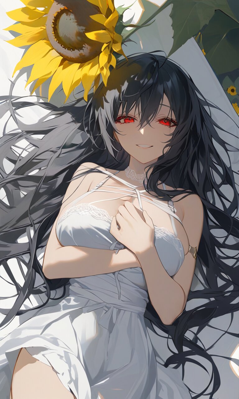 1 girl, seductive smile, red eyes, long hair, black hair, lying, (sunflower), white sundress, from above, cowboy shot, big breasts,dark , goth