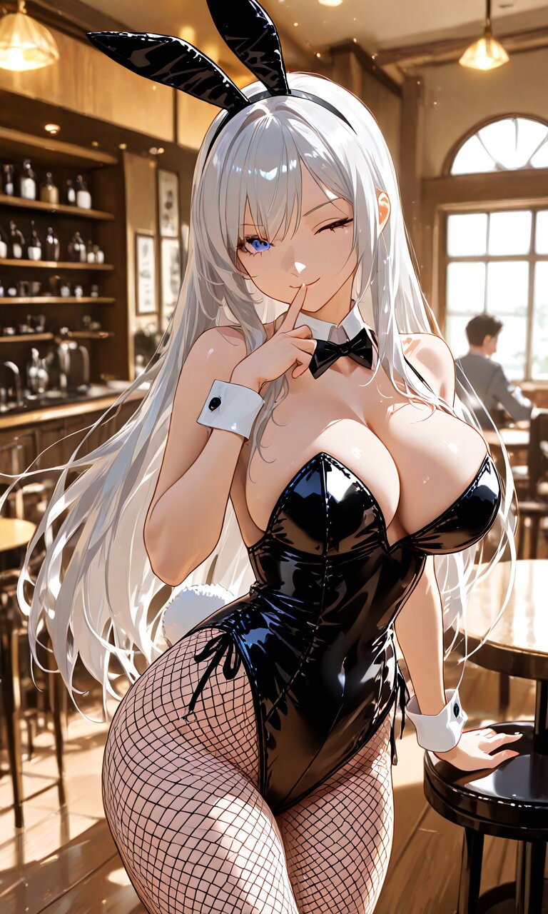 1 lady, long hair, silver hair, blue eyes, seductive smile, big breasts, ((black bunny, bunny girl)), cafe, ((wink, finger on mouth)), fishnet tights