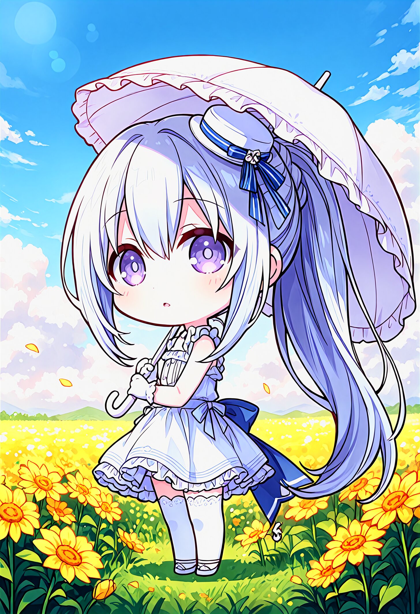 beautiful detailed background, best quality, (pale color:0.7), full body, portrait, solo, (chibi), (chibi girl:1.2), (blue sky,:1.1) cloudy sky, , parted lips,(Expressionless:0.8), big eyes,(half-closed eyes:0.8), tareme, pale purple eyes, thighhighs, (silver hair:1.1), (dark blue hair colored inner hair:0.7), long hair,very long hair,ponytail, parasol,, holding,holding parasol,, white parasol, mini hat, frills, strapping ribbon, white and blue casual dress, white gloves, gloves, standing,sun flower field,,field, looking at viewer, (profile:0.7), <lora:noline-16oa:-1.1> <lora:chibi_paru:-1.3> <lora:sdxl2-flat2-512b:-1.1>