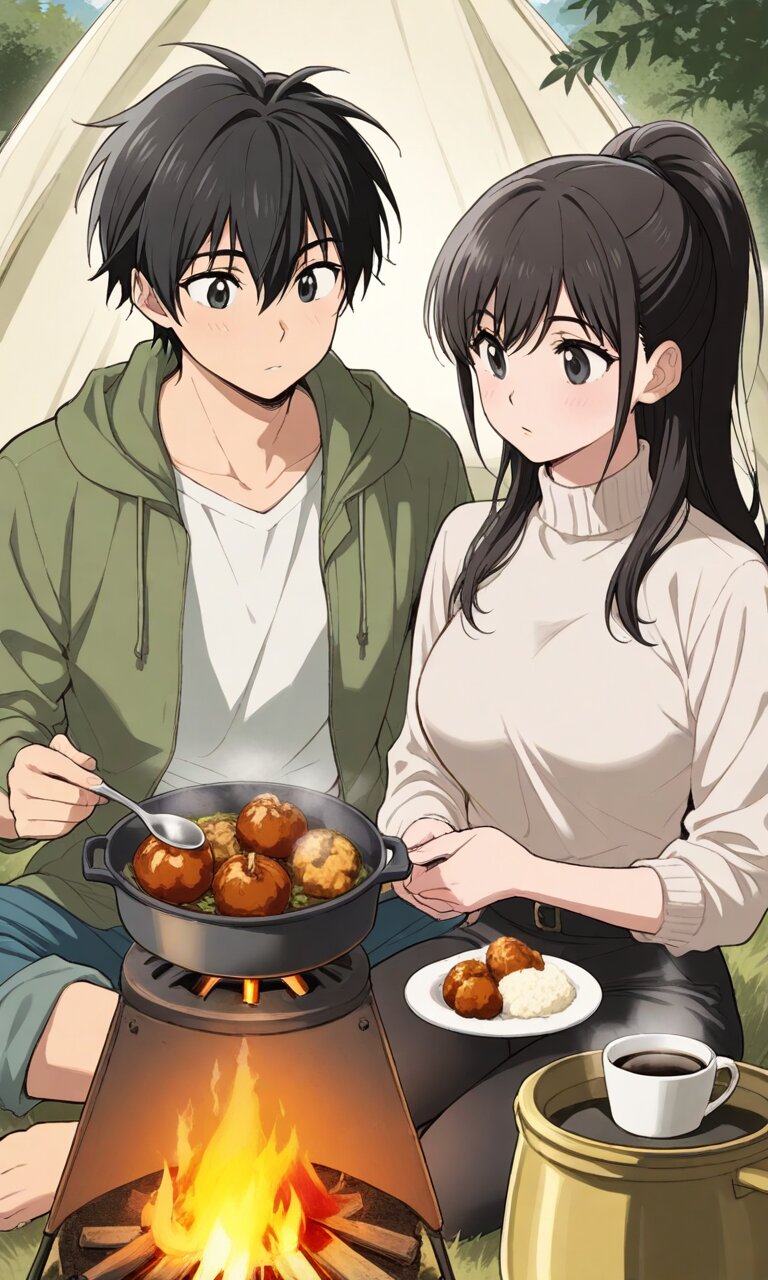 Couple, boy and girl, two people only,absurdres, ultra-detailed, master piece, high resolution, 8k, Boy, girl, couple,Rondalcia, tent, bonfire, pot, cup, coffee, pot, chicken meatball pot, spoon, BREAK the boy(original boy,black hair,short hair, black eyes) BREAK the girl(1girl, black hair, long hair, ponytail, large_breasts),