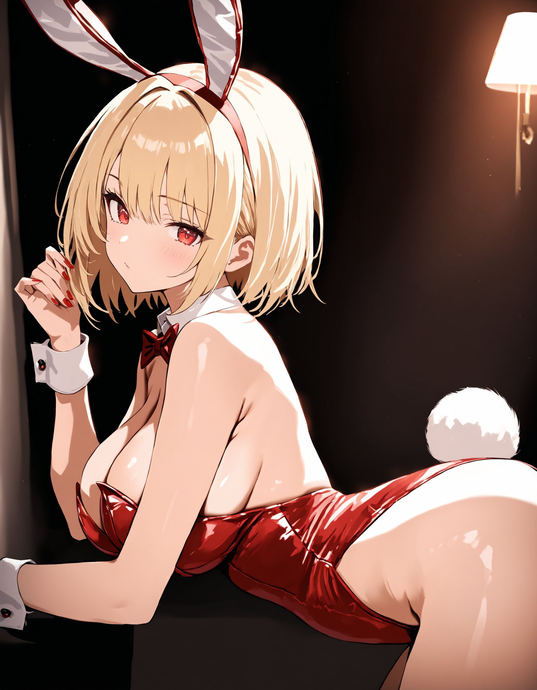 1girl, solo, short hair, blonde hair, straight hair, red eyes, large breasts, smooth skin, playboy bunny, rabbit ears, rabbit tail, masterpiece, great score, high score, absurdres