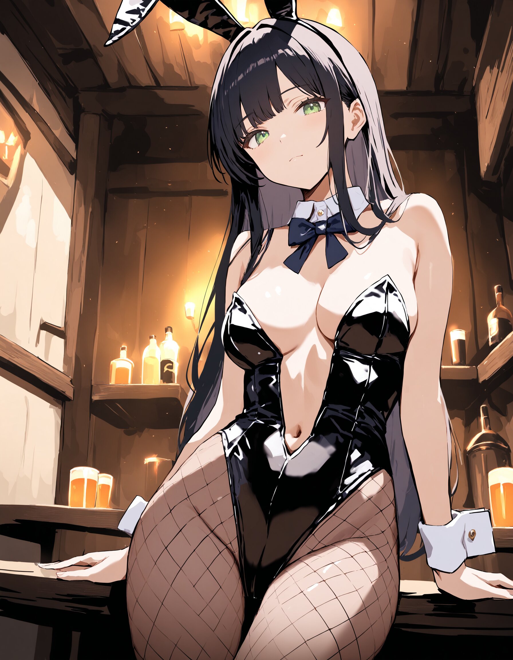 tavern, 1girl, solo, black hair, long hair, straight hair, green eyes, medium breasts, smooth skin, playboy bunny, rabbit ears, black fishnet pantyhose, plunging neckline, navel, looking at viewer, masterpiece, great score, high score, absurdres