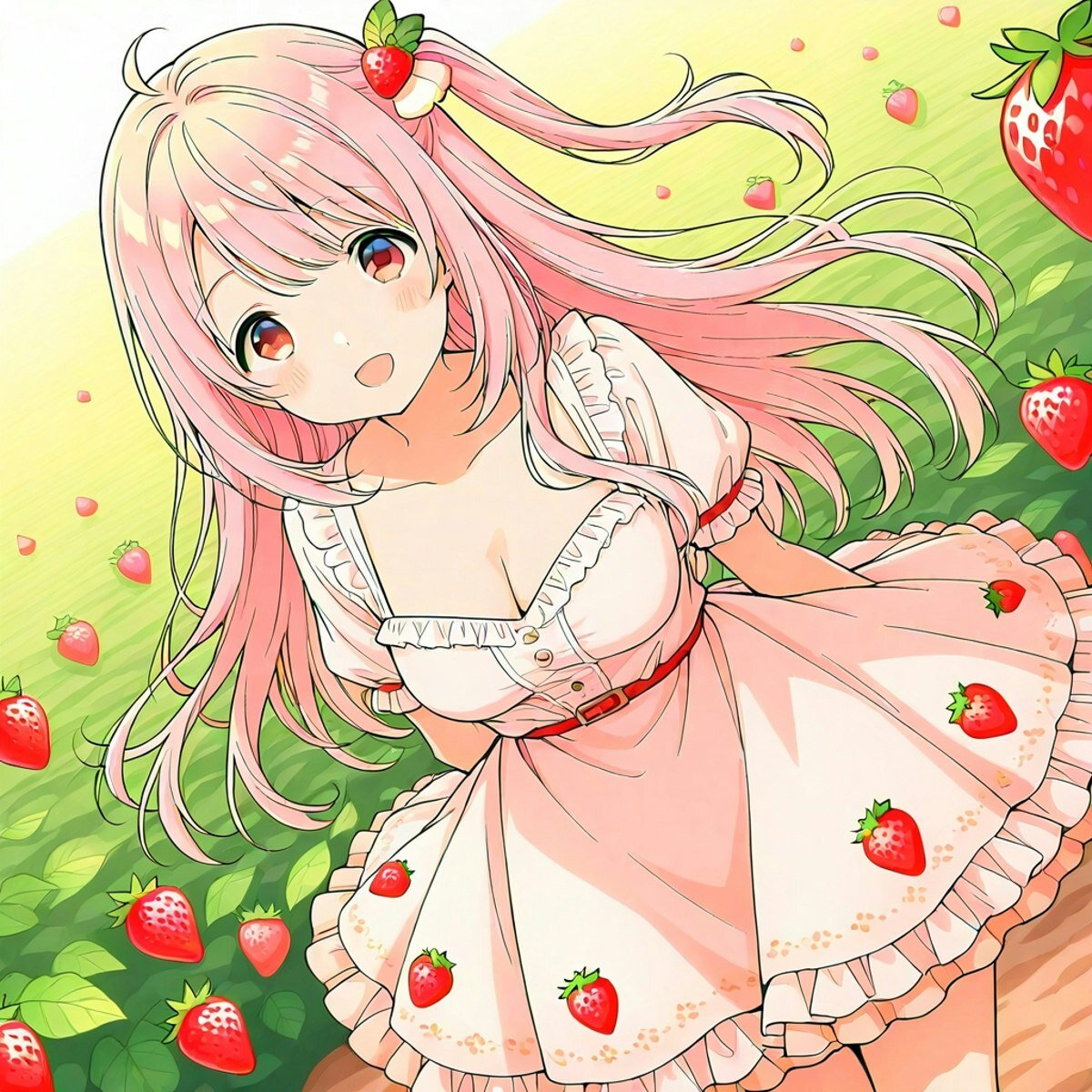 "A beautiful girl personifying the Ascalbee strawberry snack, with a charming and delicate appearance. She has long, flowing hair that resembles vibrant red strawberries with tiny green leaves as hair accessories. Her eyes are bright and sparkling like fresh strawberries, conveying innocence and sweetness. She wears a cute, frilly dress in shades of red and green, adorned with strawberry motifs and tiny leaf patterns. Her pose is graceful and inviting, standing amidst a lush strawberry field with soft sunlight filtering through. The background features blooming strawberry plants, with a whimsical and fantasy-like atmosphere. She exudes a sense of freshness, sweetness, and playful innocence, with intricate details in her clothing and accessories that highlight her strawberry-inspired design. The overall art style should be anime-inspired, highly detailed, vibrant, and lively, capturing the charming and adorable essence of a strawberry girl."