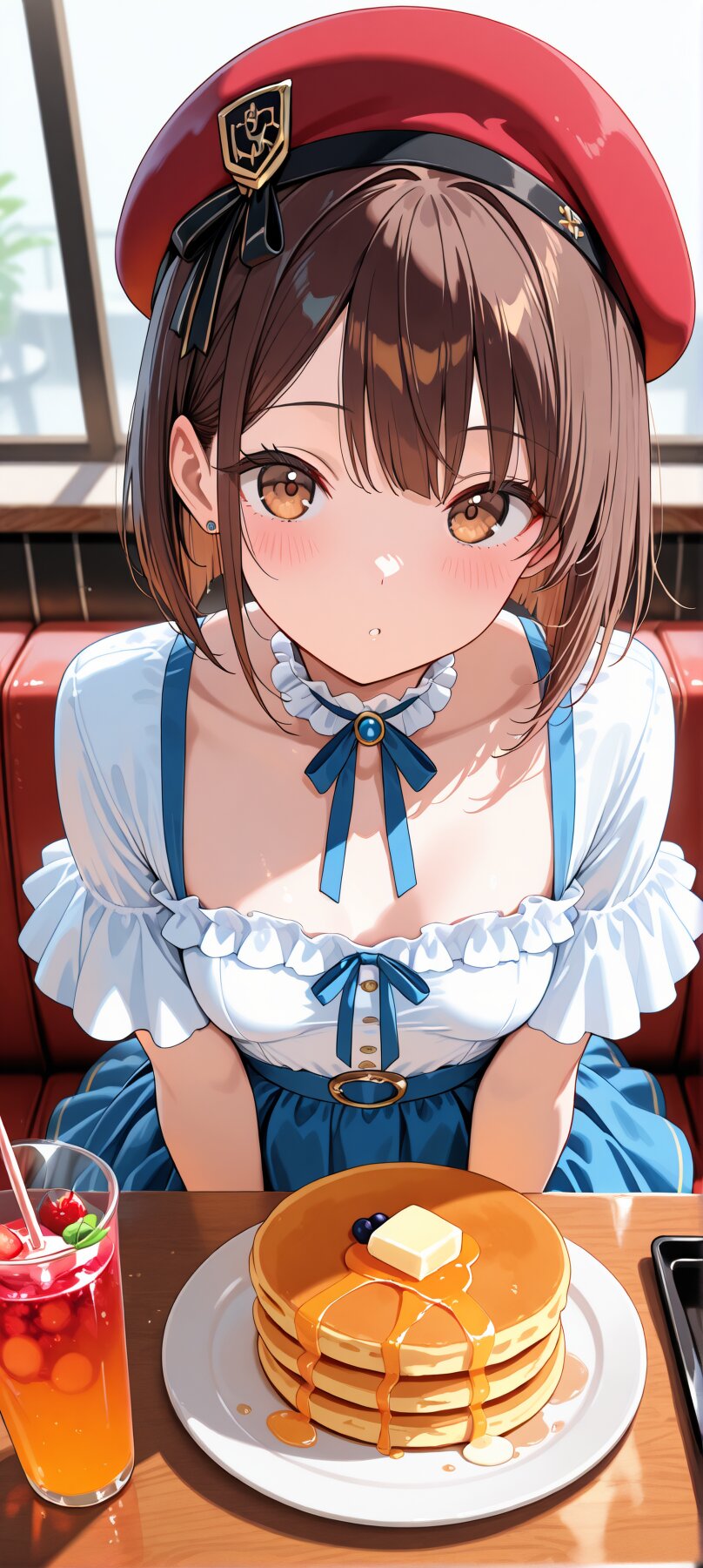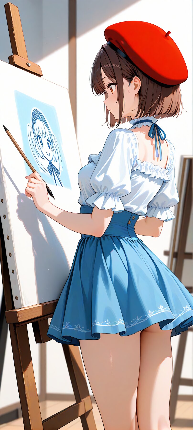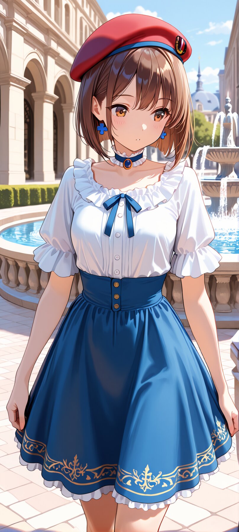 masterpiece,best quality,ultra detailed,brown hair,short bob,small_breasts,blue culotte skirt,frilled blouse,shortsleeve,frilled_choker,red beret, BREAK modern,Europe,fountain,walking,