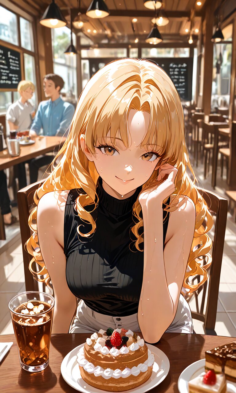 1 lady, spiral curls, long hair, blonde hair, breasts,sleeveless shirt, short pants, sweat, cafe, iced tea, cake, sitting, smile, relaxed