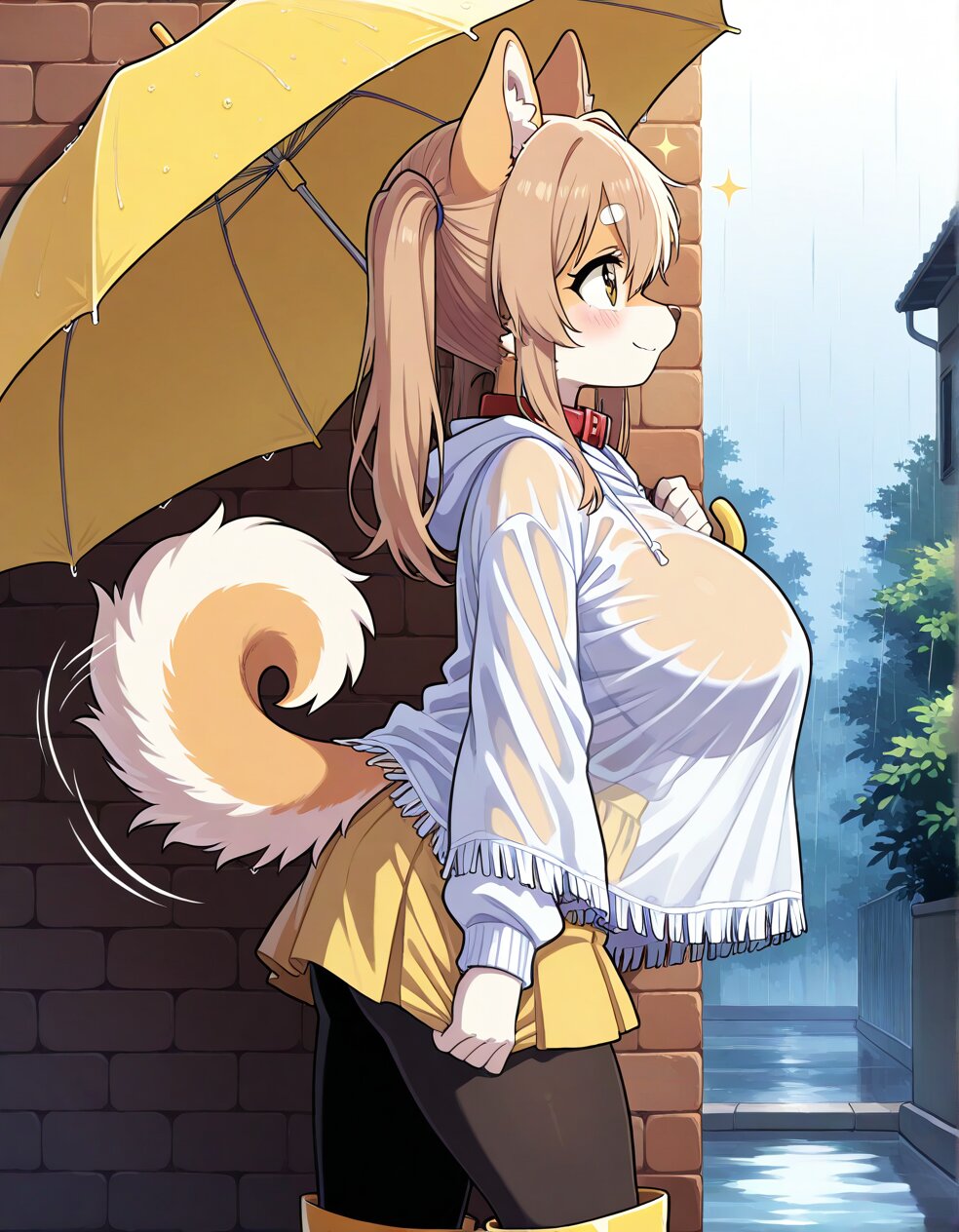 1girl,(loli),((very short)),short female,oppai loli,(dog girl),(shiba-inu girl),(furry female),(snout:1.3),shiba-inu ears,shiba-inu tail,fluffy body fur,stand fur,curled tail,dog paws,(huge breasts),light-brown hair,long hair,long twintails,white thick eyebrows,hair between eyes,brown eyes,round eyes,see-through poncho,transparent poncho,rain poncho,animal collar,white sweater,ribbed sweater,yellow chiffon skirt,black pantyhose under the skirt,wide A-line,yellow rubber boots,smile,closed mouth,arm at side,wagging tail,holding yellow umbrella,walking to the side,looking ahead,profile,water drop,wet umbrella,around corner,rain background,brick wall background, foreshortening,perspective,saturated,smooth,from side,hair shade,((high contrast)),(anime coloring),(kawaii),softy,(2D),(cute),furry,(two tone fur),(furry body),perfect body,detailed face,high quality,cute clothes,animal tail,animal ears,solo,masterpiece,((correct_anatomy)),gddw,,pretty and cute,masterpiece, ((oppailoli)), shortstacks, petite,((correct_anatomy)), eye focus,sparkle ,highly detailed, ultra-sharp, 8K resolution,((oppailoli)), shortstacks, petite,((correct_anatomy)), eye focus,sparkle ,highly detailed, ultra-sharp, 8K resolution,lolitaaa, girl, small body, short girl, petite, very short, tiny, cute,,gddw,(detailed_hands:1.5)
