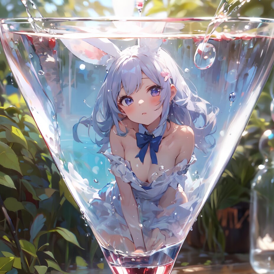 masterpiece, best quality, 1girl, kawaii, bunny girl, soaking in big transparent wine glass, Wariza, filled with cool liquid, bubble,