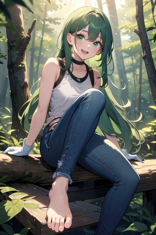 green hair, very long hair, green eyes, gloves, barefoot, (long toes:1.3), (long jeans:1.4),smile,open mouth, forest background