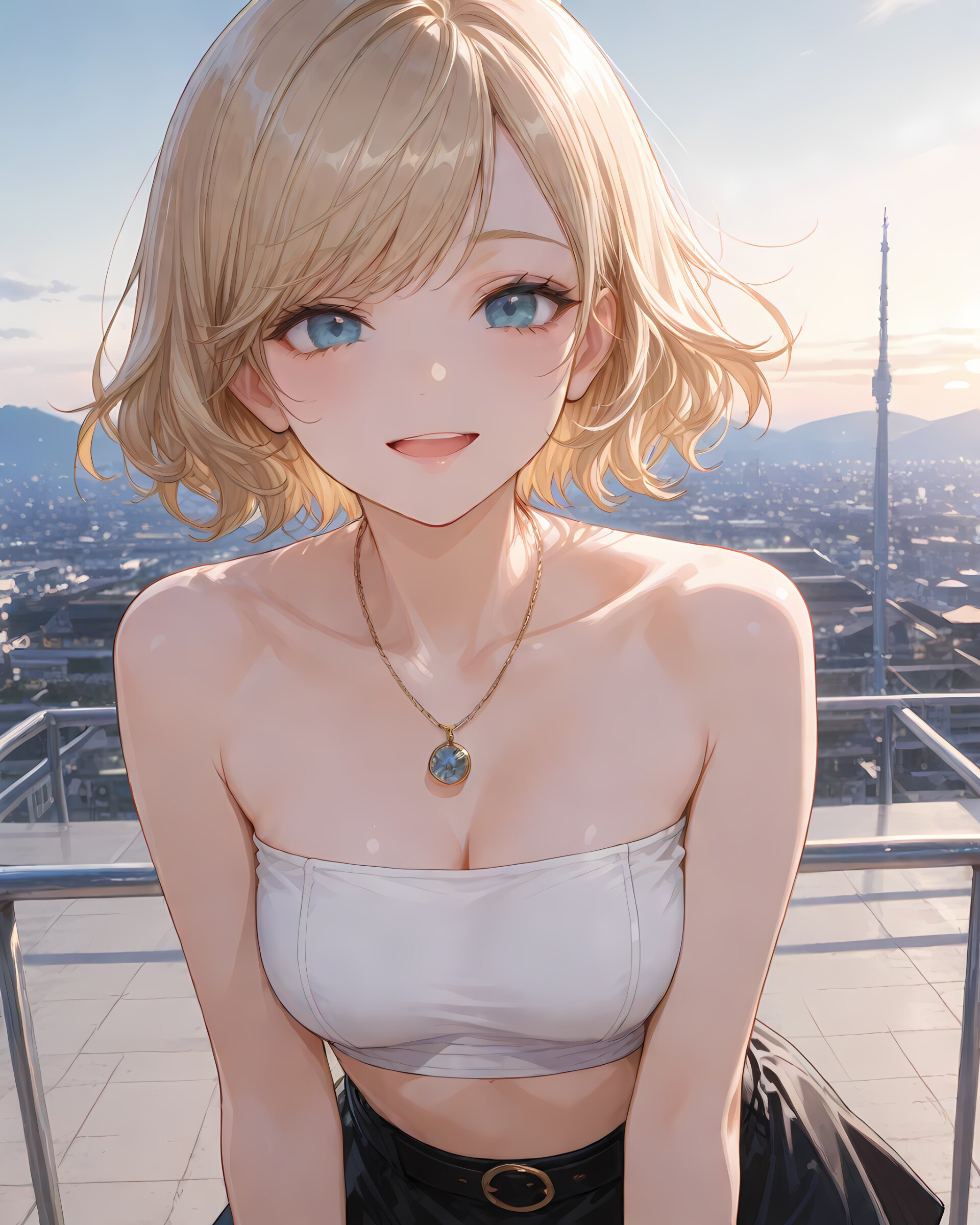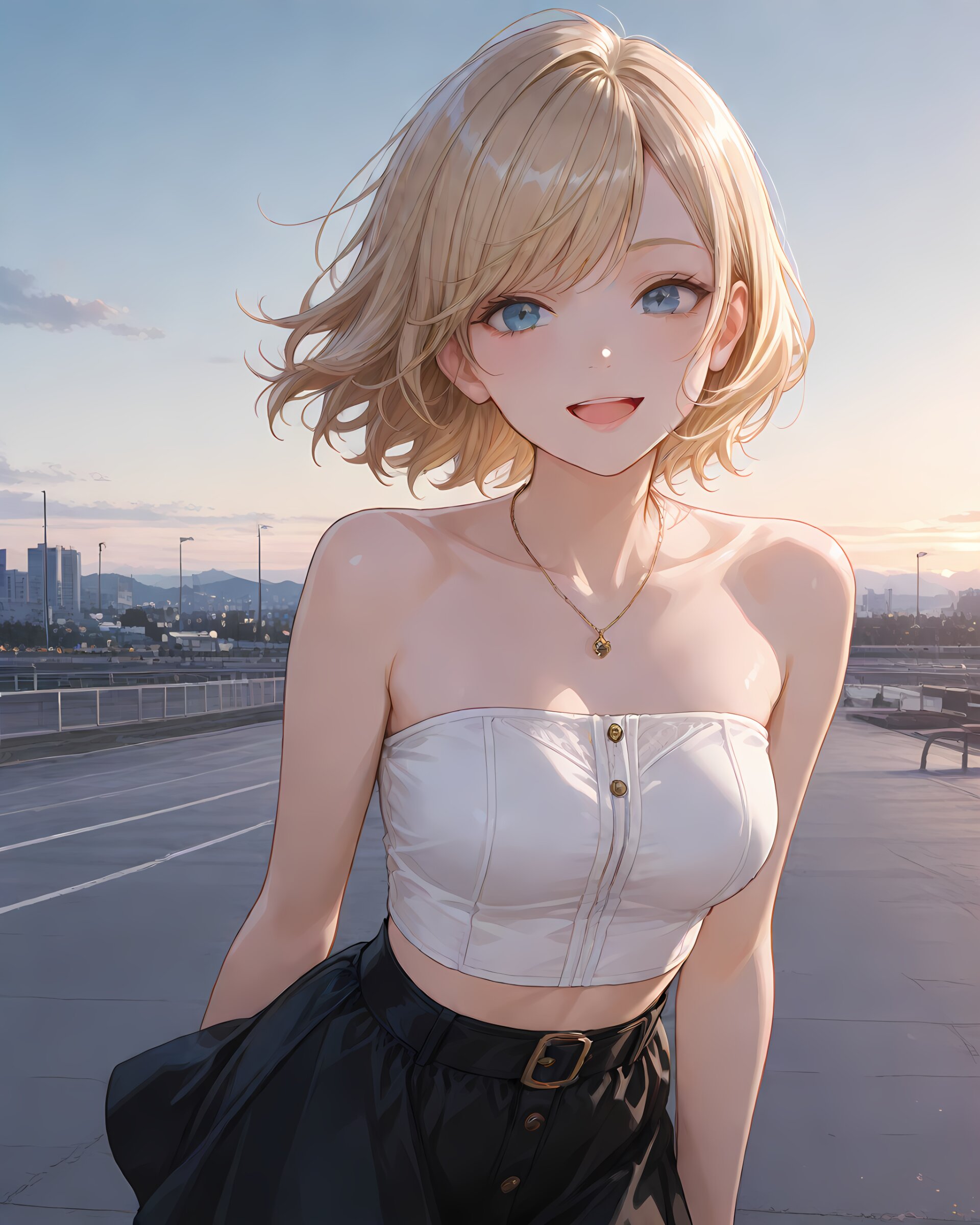 <lora:hyper_sdxl_8_step_lora_f16:1>,, 1girl, standing, sky, park, summer, soft natural light, focus on face, close-up, BREAK 18 years old, girl, short hair, wavy blonde hair, swept bangs, medium breasts, slender, frosty blue eyes, black short skirt, white tube top, smile, open mouth, necklace, BREAK masterpiece, amazing quality, best quality, very aesthetic, ultra-detailed,