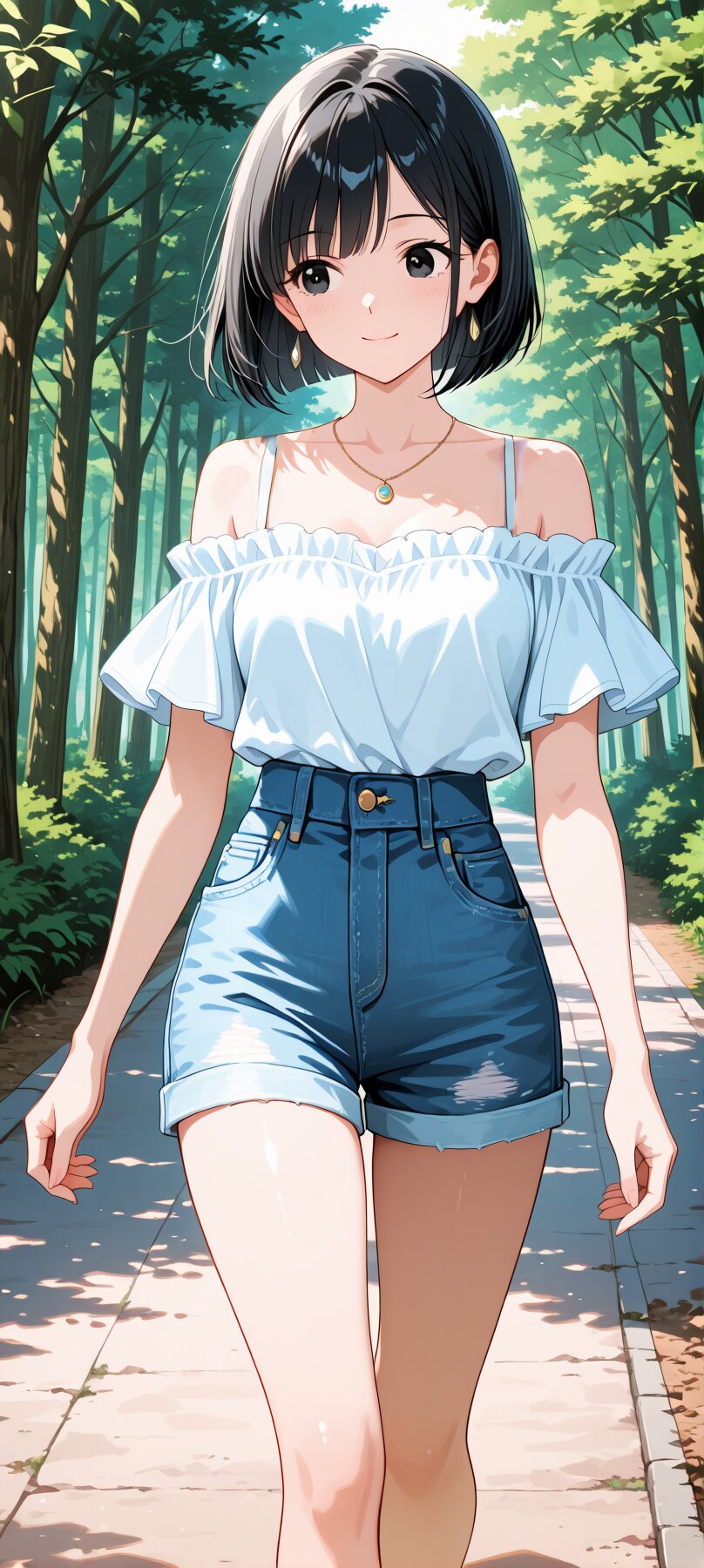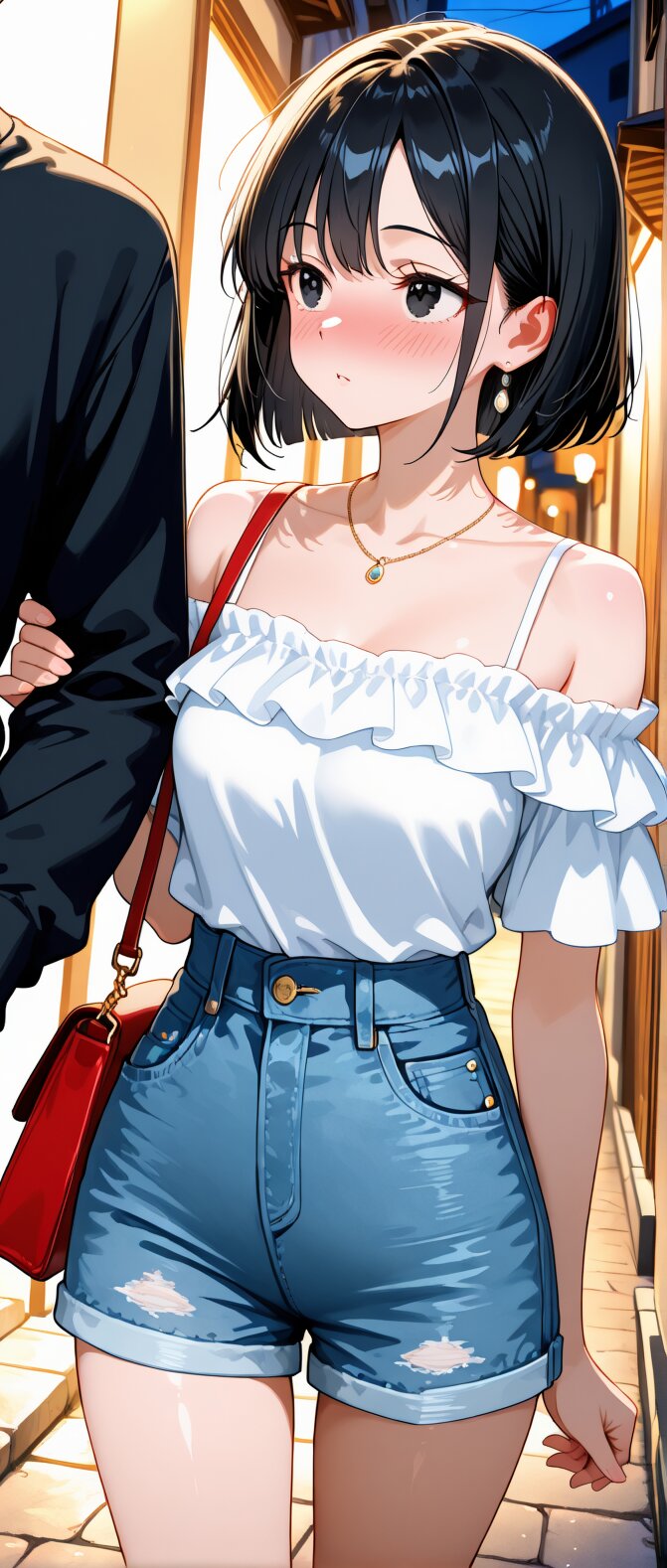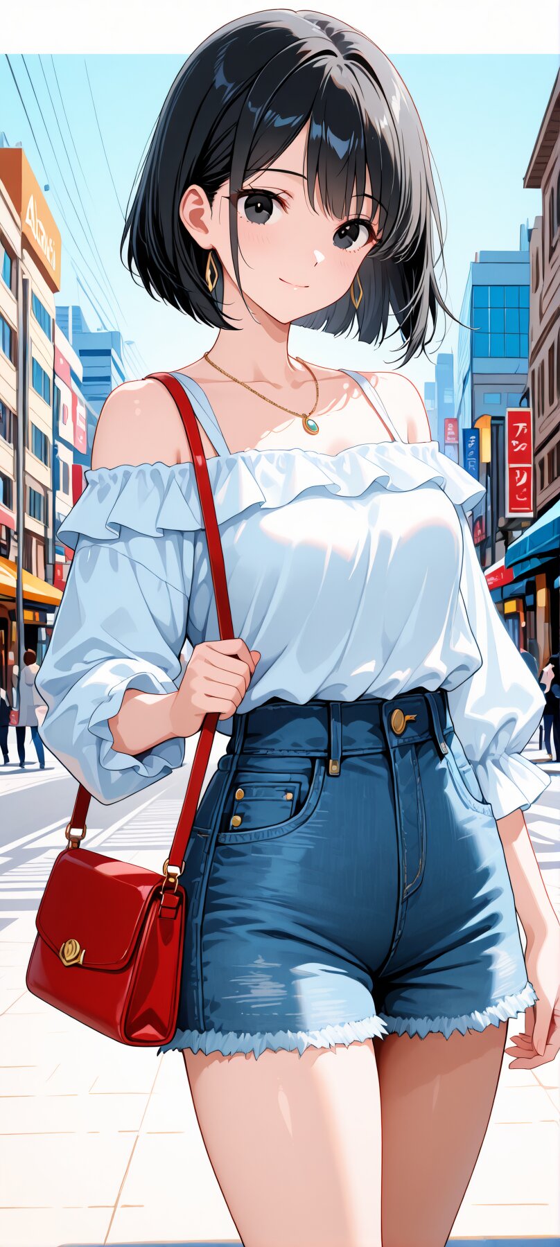 anime style,a kind and gentle girl,bob cut,black hair,soft smile,black eyes,big expressive eyes,wearing a casual white off-shoulder top,denim short pants,a small elegant necklace,natural pose,pure and graceful atmosphere,soft pastel background,high quality,clean lines,detailed shading, BREAK Bustling city,shoulder bag,
