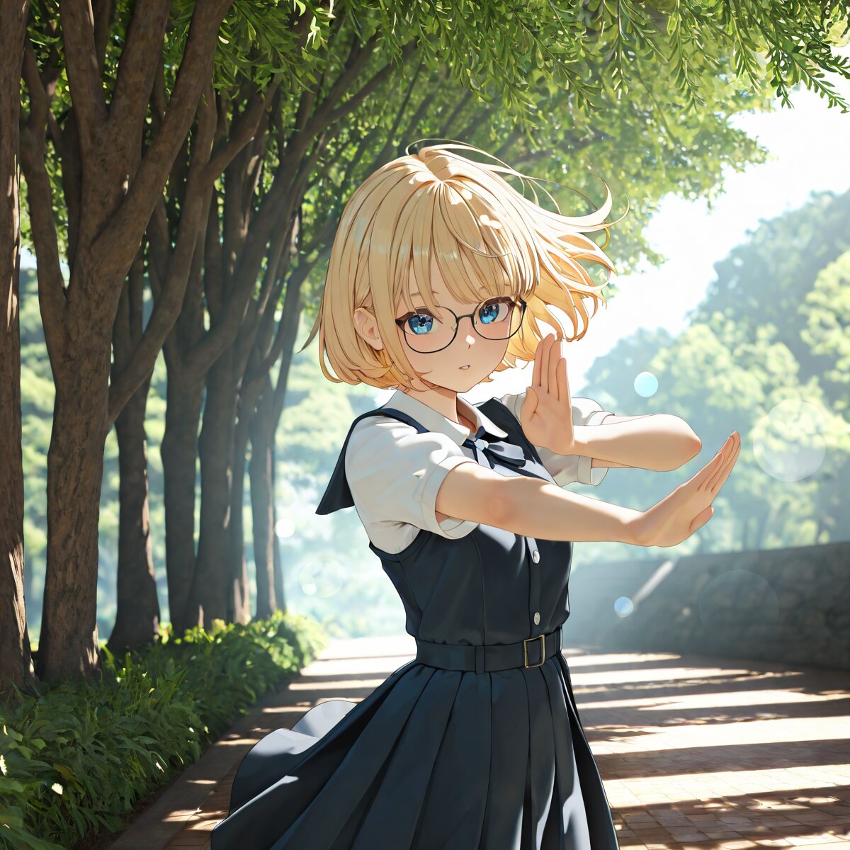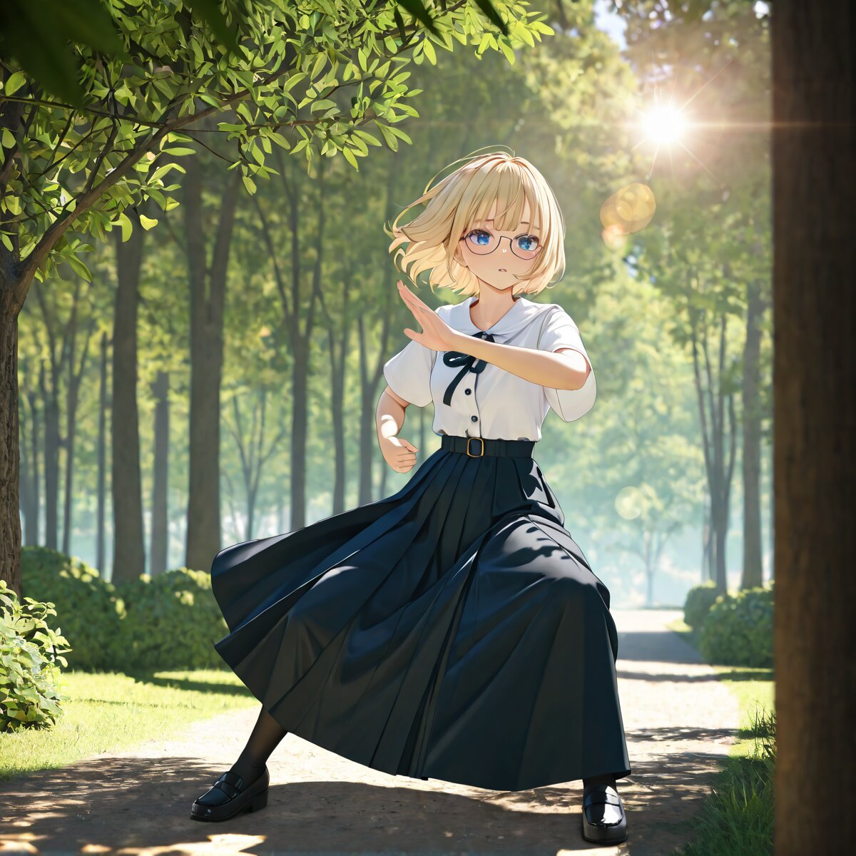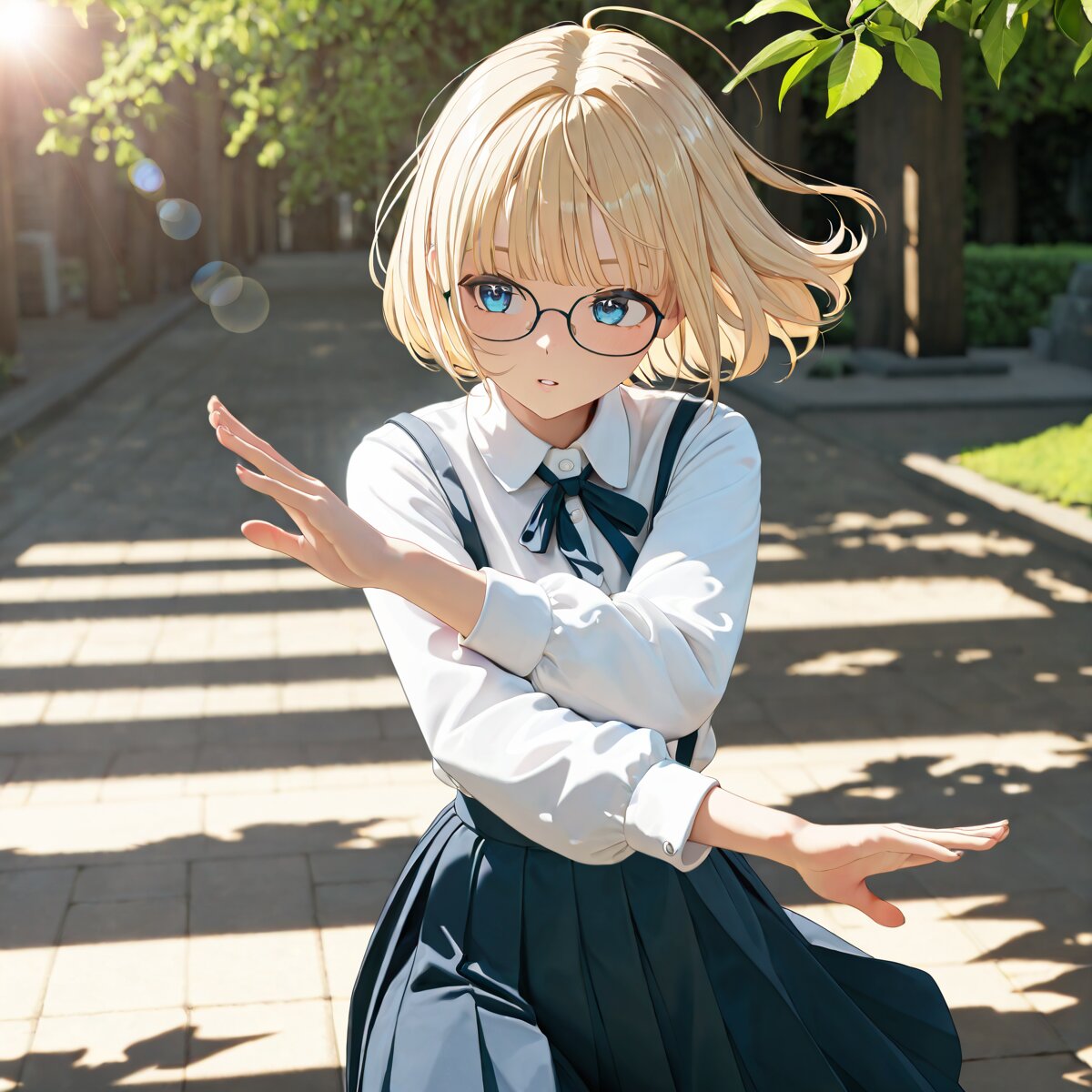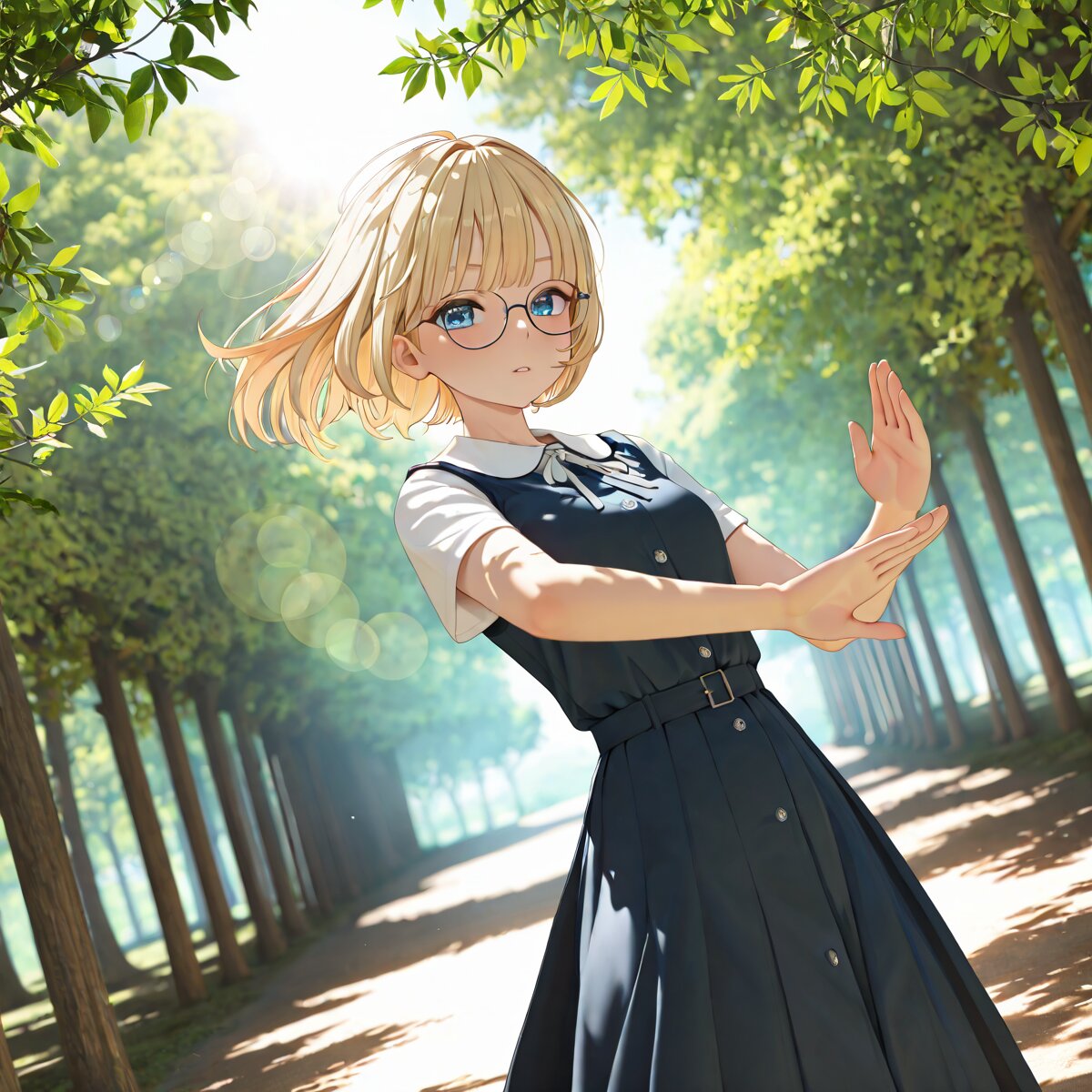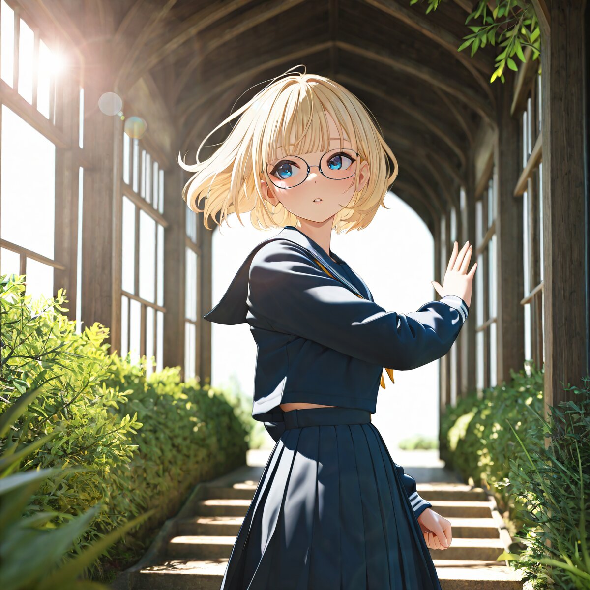 masterpiece, best quality, amazing quality, 4k, very aesthetic, high resolution, ultra-detailed, absurdres, newest, scenery, 3d, rendered, 1girl, solo, glasses, blonde hair, short hair, choppy bangs, parted lips, blue eyes, Swayback stance, soft lighting, floating hair, BREAK, hands, fingers, (dappled sunlight, lens flare:1.2), vignetting, dramatic shadow, cinematic lighting, rim light, detailed background, depth of field, vignetting, volumetric lighting