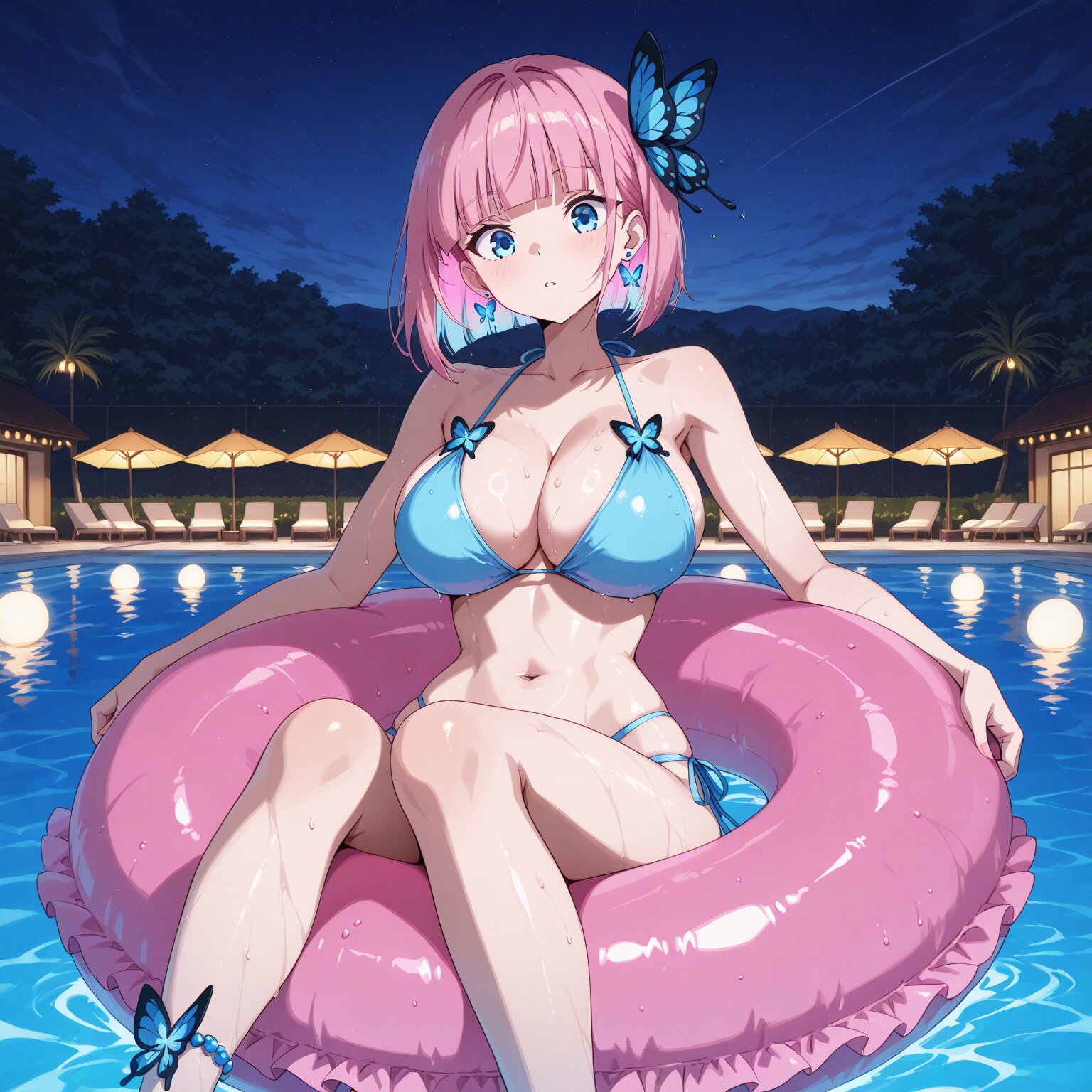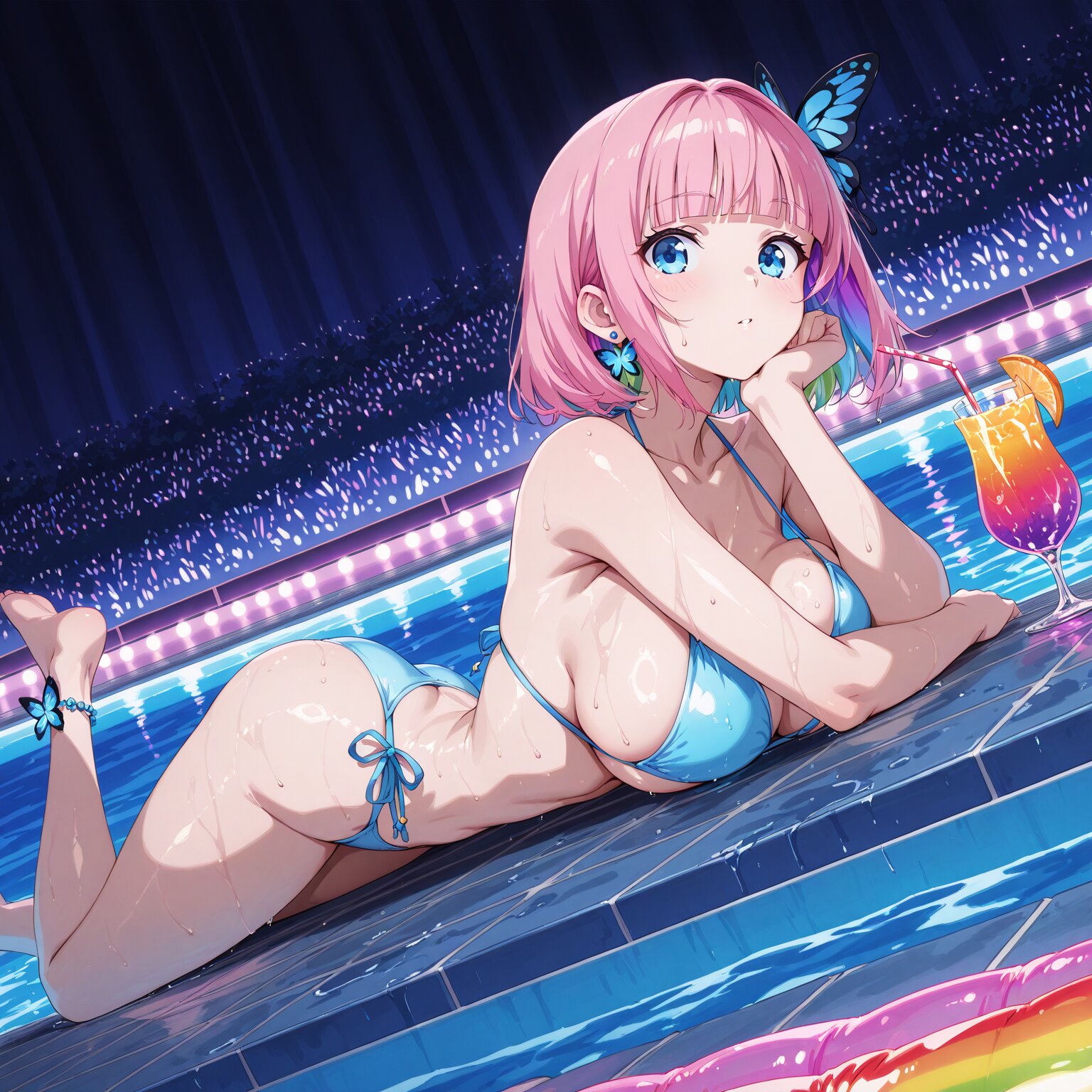 (1girl), BREAK, ((bob hair)), short hair, (pink bob hair:1.4),((light blue eyes)),((round eyes)), (Scrawny), saggy big breasts, huge breastes, tight waist, skinny, sweat, (((blunt bangs))), BREAK, (blue colored inner hair), blue glowing eyes, sweat, (white skin:0.7), shiny body, shiny skin, butterfly earrings, BREAK, Slender, narrow waist, toned body, athletic body, shiny skin, beautiful pupils, Clear eyes, beautiful eyes, Light blue bikini, butterfly ribbon, butterfly decoration, butterfly hair accessory, butterfly anklet Night swimming pool, glowing pool, glowing water, night, lights, sparkling, ((rainbow-colored swimming pool:1.3)) (( many girls in the background:1.5)) On a swim ring, legs raised, barefoot, wet body, ((Drinking tropical juice:1.3)) BREAK, ((newest, year 2024, anime, animation, anime screen capture, anime style:1.3)) BREAK, ((masterpiece, , vibrant, very aesthetic, highly detailed, best quality, 16k:1.3)) Perfect hands, perfect fingers,