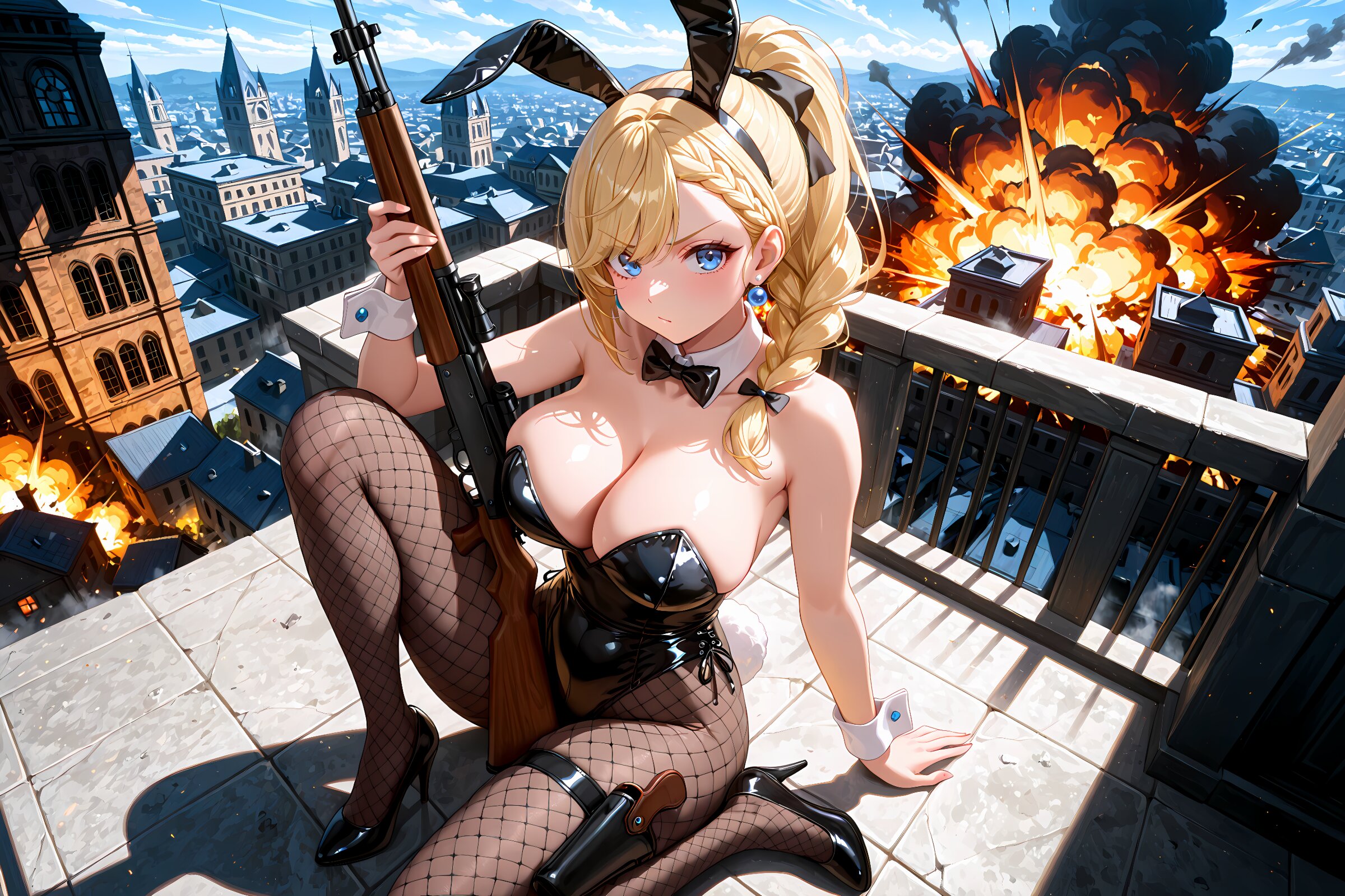 close-up, from above, solo,1girl,sitting,one knee up,dynamic pose,>:/, holding sniperrifle,bunny girl,black bunny suit,large breasts, satin black leotard,black fishnet tights, visible mesh pattern tights,black high heels, blue eyes,blonde hair, ((high ponytail, braided ponytail,))Hair tied up at the back of the head with black ribbon,asymmetrical side swept bangs,braided bangs,black bunny ears,blue pearl earrings,white choker and black bow tie,side holster on thigh, fluffy bunny tail, smooth skin, elegant proportions, shoulder bare,large breasts, battlefield, burning building, explosion,cinematic lighting,((4k,8k,Ultra HD)),((Masterpiece :1.2)),((Best quality :1.2)),((Detailed :1.5)),((Detailed background :1.5)),high resolution, more details, 8k quality