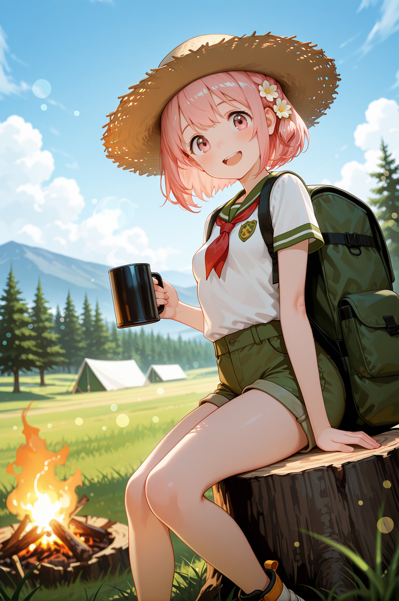 ガールスカウト風ファッションで、夏休みにキャンプ⛺を楽しむひなこさんを生成しました(*´ω`*)