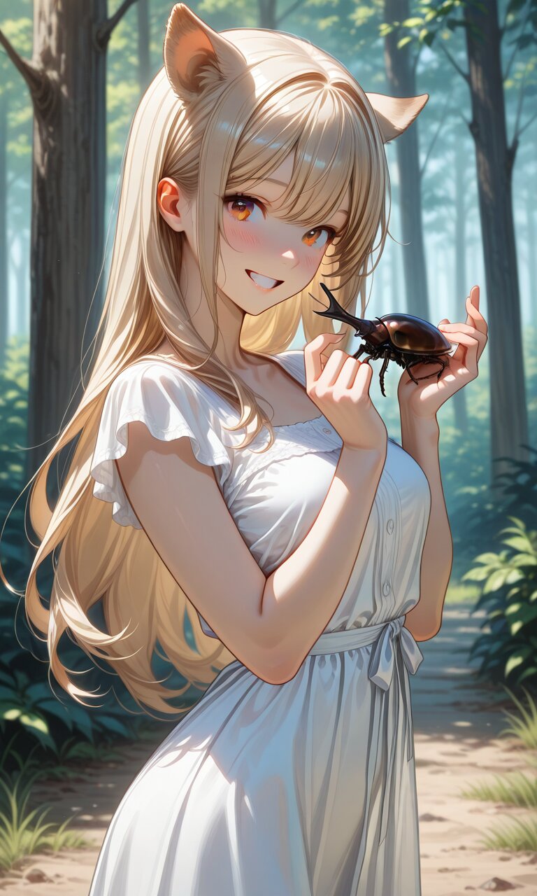 score_9, score_8_up, score_7_up, source_anime, sfw:1.2, masterpiece, best quality, high resolution, ultra-detailed, 2d, anime style, anime color, anime:1.4, sharp focus, nice hands, perfect hands, perfect anatomy, perfect structure, (background is Early morning in the forest. A big rhinoceros beetle), (On a Morning, the girl is stay in forest, holding rhinoceros beetle with an open mouth grin smile), outdoors, 1girl, solo, cowboy shot, from side, high angle, ((close-up eyes:1.2)), (face focus:1.2), (She is wearing an simple dress). ultra detailed lips, ultra detailed face and hair, kawaii, adorable, cute, light brown hair, long hair, amber eyes, wild boar's ears, medium breasts, wide hip,, <lora:elf-san_alpha1(AnimagineV31):0.7> <lora:Elf-san_alpha7(IL2.0):0.7>