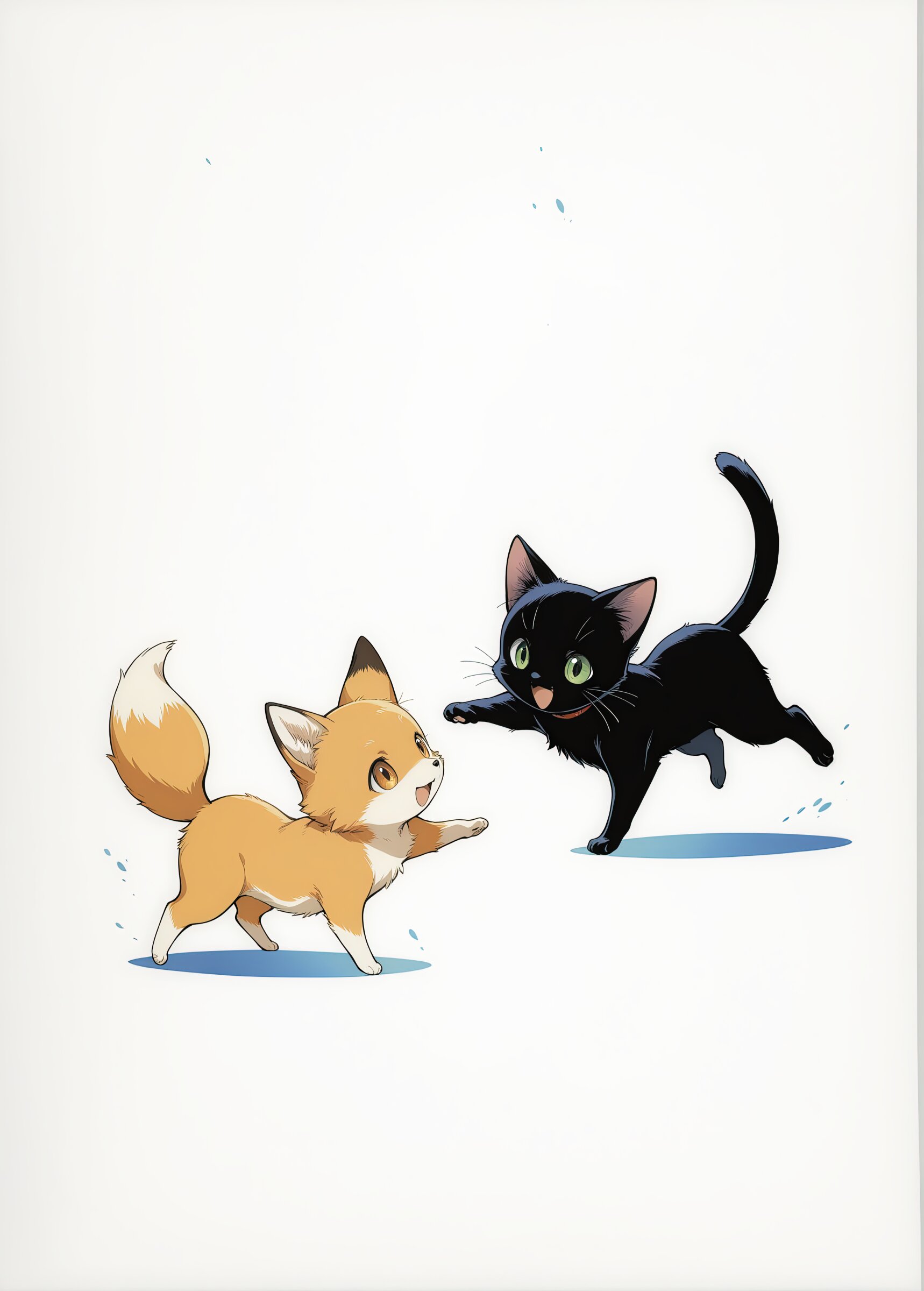 Best quality, Masterpieces, simple background, negative space, anime-style illustration, white background, fine detail, 2animals, cute small fox cub and a black cat, happy, dynamic pose, cinematic angle, official art, official wallpaper, Midday at school during recess. Students play in the schoolyard, bring their lunches, and enjoy a fun time with friends