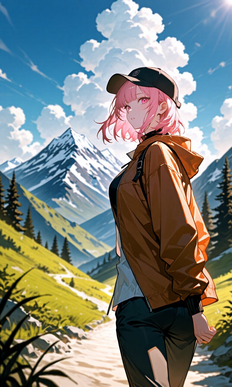 pink short hair,pink eyes,Long sleeves and long pants, baseball cap, walking on a mountain trail, summer snow-capped mountains in the distance, blue sky, white cumulus clouds,upper body