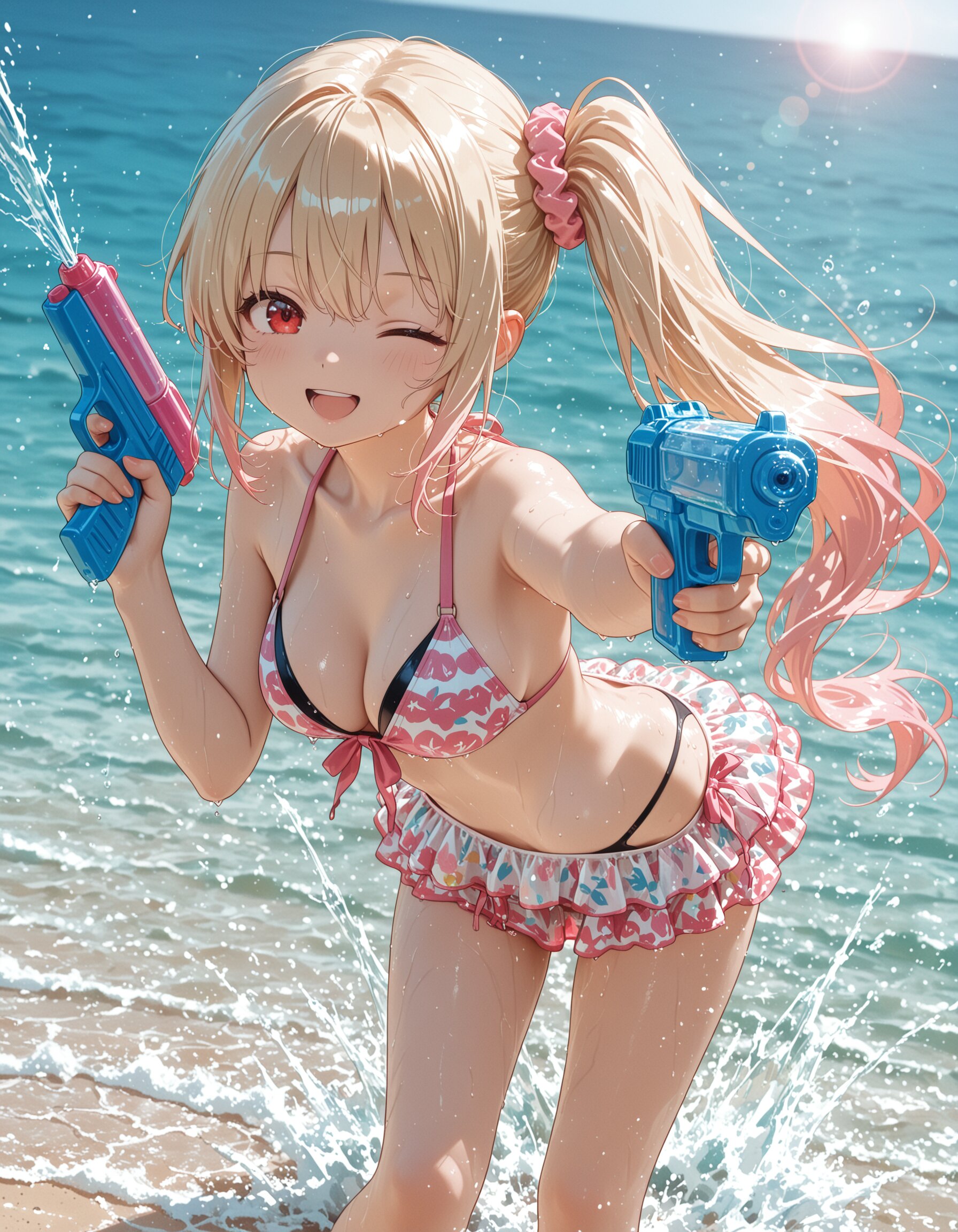 masterpiece,best quality,amazing quality,incredibly absurdres,solo,kawaii,cute,blonde hair,general,(wavy very long side ponytail:1.1),pink-gradient-hair,pink scrunchie,red-eyes,medium breasts,smile,open mouth,layered Bikini skirt,patterned,gravure_pose,dynamic angle,drama layer,blurry background,ocean,holding water gun,splashing,aiming at viewer,wet,one eye closed,half open eye,available light,depth of field,lens_flare,
