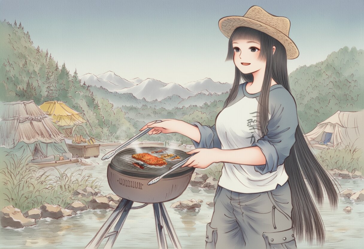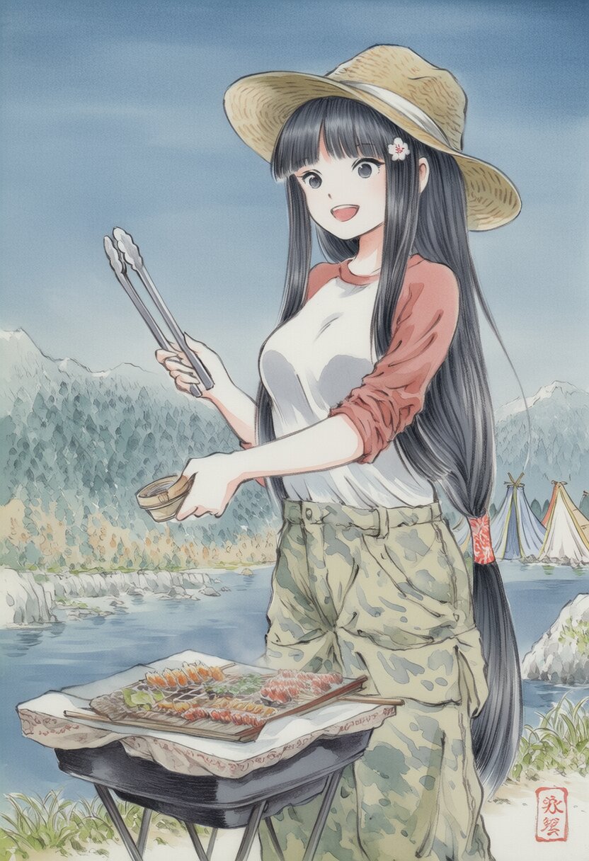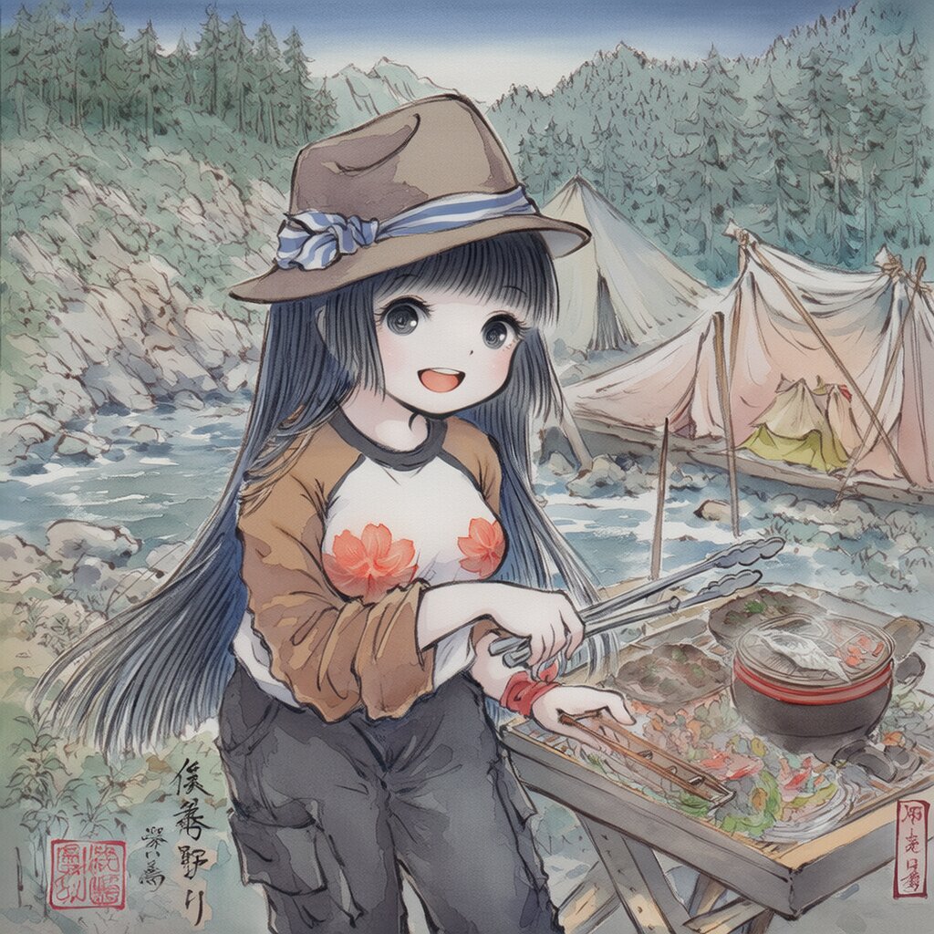 {{{highly detailed}}}, {{{traditional media}}}, {{{beautiful detailed}}}, {{intricate}}, {{{{ukiyo-e}}}}, 1girl, solo, taketori monogatari, {{kaguya hime}}, black hair, very long hair, hime cut, black eyes, hair ornament, large breasts, smile, open mouth, {{{hat, fedora, raglan sleeves, cargo pants}}}, {{hold a pair of tongs}}, {{{barbecue}}}, {{{{{tents}}}}}, mountain, forests, river, rocky area, blue sky, cowboy shot, standing, {{{masterpiece}}}, {{{best quality}}}, {{{very aesthetic}}}, {{{ultra-detailed}}}, {illustration}, {{{extremely detailed}}}, {{{an extremely delicate and beautiful}}}