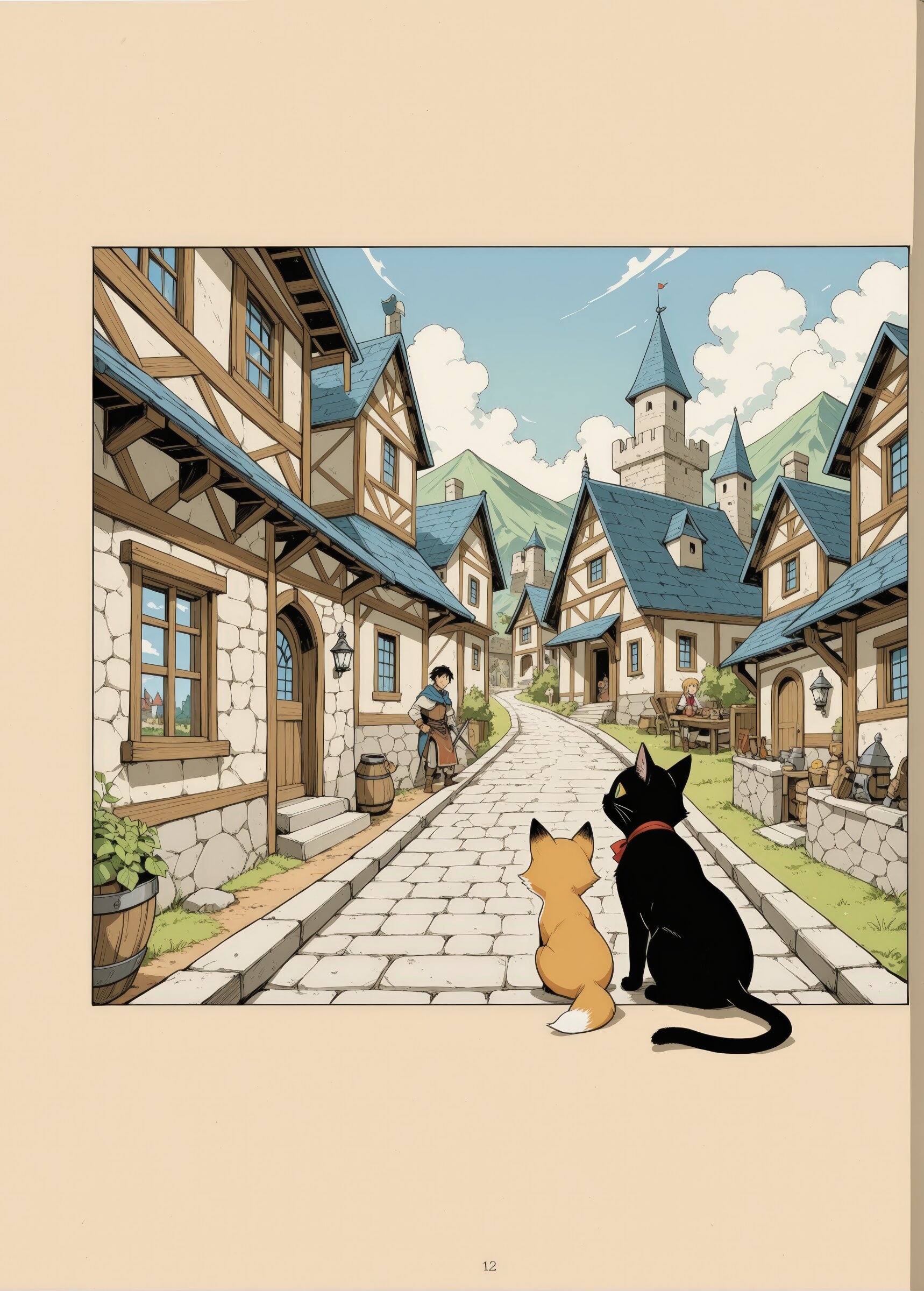 masterpiece, best quality, Hand-drawn sketch style, line drawings, rough shading, crosshatching, minimal coloring, vintage manga style, soft natural light, illustration style as if in an art book, line and wash, photographic angle, realistic background, anime style character, anime-style illustration, ARIAHAN, once a prosperous country that ruled the world, is now a small country because of the war. It is a country-like castle town on a small continent with a large castle and peaceful city. It is a friendly country with a peaceful, idyllic atmosphere. It is home to the birthplace of a hero, a brave man who will eventually save the world. The town features Rueda's Tavern, where adventurers from all over the world gather. a world of swords and sorcery, 2animals, cute small fox cub and a black cat
