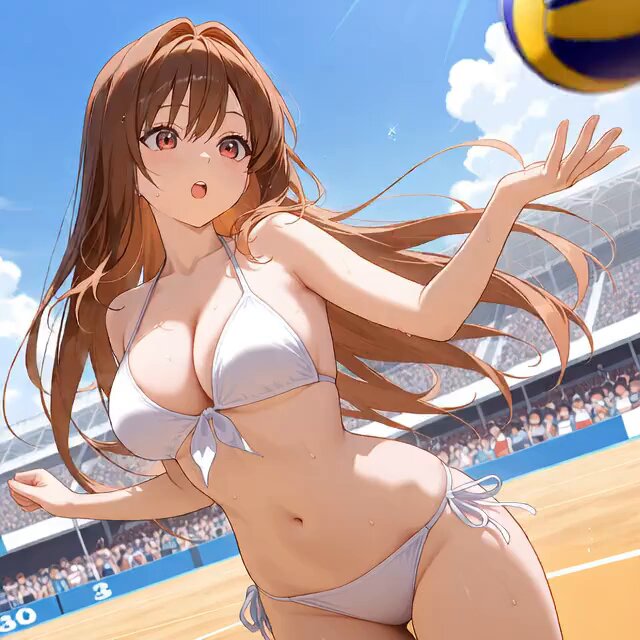 The girl is playing the beach volleyball. 少女はボールを腕で打ち返す。 The girl hits the ball by arm. 女孩挥动手臂,将球击打回对方场地。