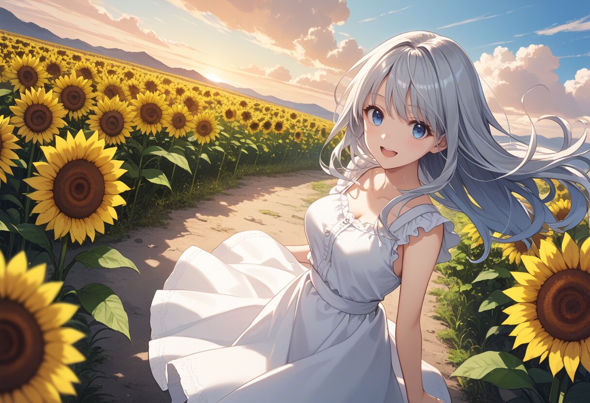 score_9,score_8_up,score_7_up,source anime,best quality,masterpiece,8k,extremely detailed CG unity 8k wallpaper,dynamic_angle,depth of field,(1girl:1.2),silver long hair,medium breasts,(big breasts:0.8),bishoujo,blue eyes,around sunflower,in summer,sky,smile,landscape,from_above,(20yo:1.1),wind,adult,Slightly_open_mouth,