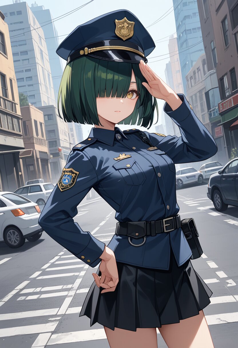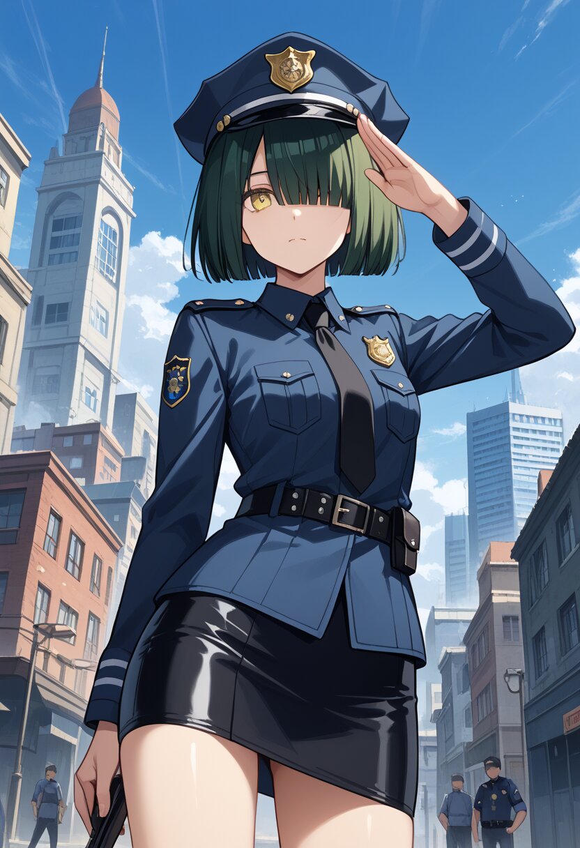 score_9,score_8_up,score_7_up,source anime,best quality,masterpiece,8k,extremely detailed CG unity 8k wallpaper,cowboy_shot,dynamic_angle,1girl,((jitome:1.3),medium bob cut,blunt ends,yellow eyes,,dark green hair,slender,,hair over one eye),bishoujo,police upper uniform,salute,city,police hat,leather skirt,