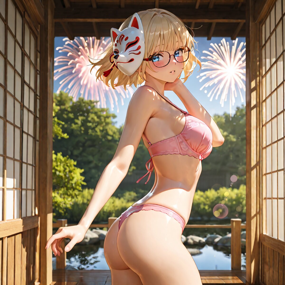 masterpiece, best quality, amazing quality, 4k, very aesthetic, high resolution, ultra-detailed, absurdres, newest, scenery, 3d, rendered, backlit, 1girl, solo, glasses, blonde hair, short hair, traditional kitsune mask, looking back over the shoulder, blush, choppy bangs, parted lips, blue eyes, pink thong sexy panties, full coverage bra, cowboy shot, The veranda of a Japanese house, Pond at your feet, Fireworks reflected on the pond, motion blur, medium breasts, portrait, dynamic, floating hair, BREAK, hands, fingers, (dappled sunlight, lens flare:1.2), vignetting, dramatic shadow, cinematic lighting, rim light, detailed background, depth of field, vignetting, volumetric lighting
