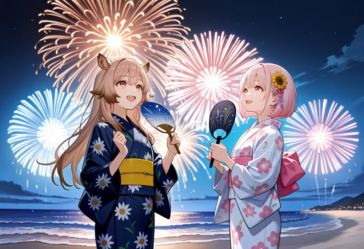 2girls,(light brown hair,long hair,amber eyes,wild boar's ears,bangs,holding japanese fan),smile,open mouth,(long white yukata,sunflower patterned yukata,blue obi),slender girl,looking up,night,dark night,many large fireworks,sea,beach,summer,outdoors,cowboy shot,fantasy,from below BREAK 2girls,(light pink hair,light pink eyes,loose wavy hairstyle,short bob cut,floral hair accessory,holding japanese fan),happy smile,open mouth,(long white yukata,sunflower patterned yukata,pink obi),slender girl,looking up,night,dark night,many large fireworks,sea,beach,summer,outdoors,cowboy shot,fantasy,from below BREAK masterpiece,best quality,highres,highly detailed,detailed eyes,general,(holding japanese fan,looking up),night,dark night,many large fireworks,sea,beach,summer,outdoors,cowboy shot,fantasy,from below,
