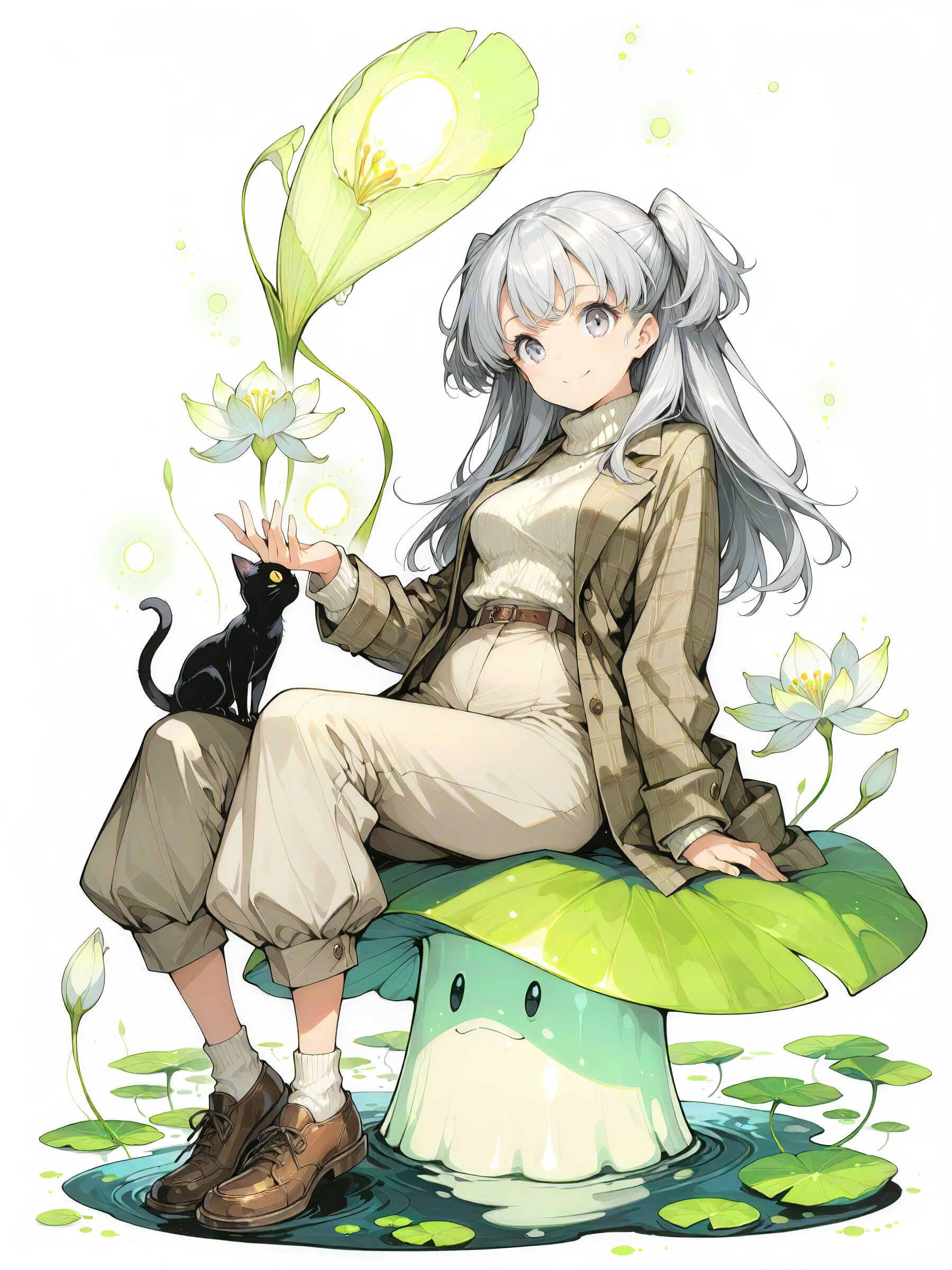 Best quality, Masterpieces, simple background, lots of negative space, anime-style illustration, white background, fine detail, solo, (young girl), Very intelligent and clever, always acts as if she is masterful, silver hair, two side up, long twintails, beautiful silver eyes, clear skin, (small body), medium breasts, pretty face, friendly personality, happy, Leaning back with hands stretched out, Tweed sport coat layered atop a knit polo, matched with wool trousers and monk strap shoes, content, mysterious composition, misty swamp, floating lily pads with glowing edges, small wise-looking frog sitting on a large toadstool, soft eerie green light, cute black cat