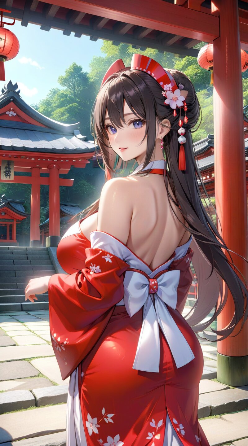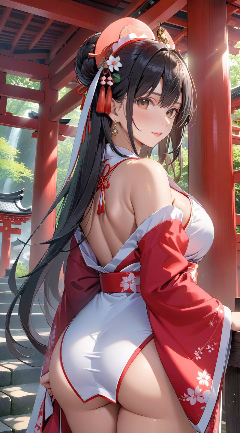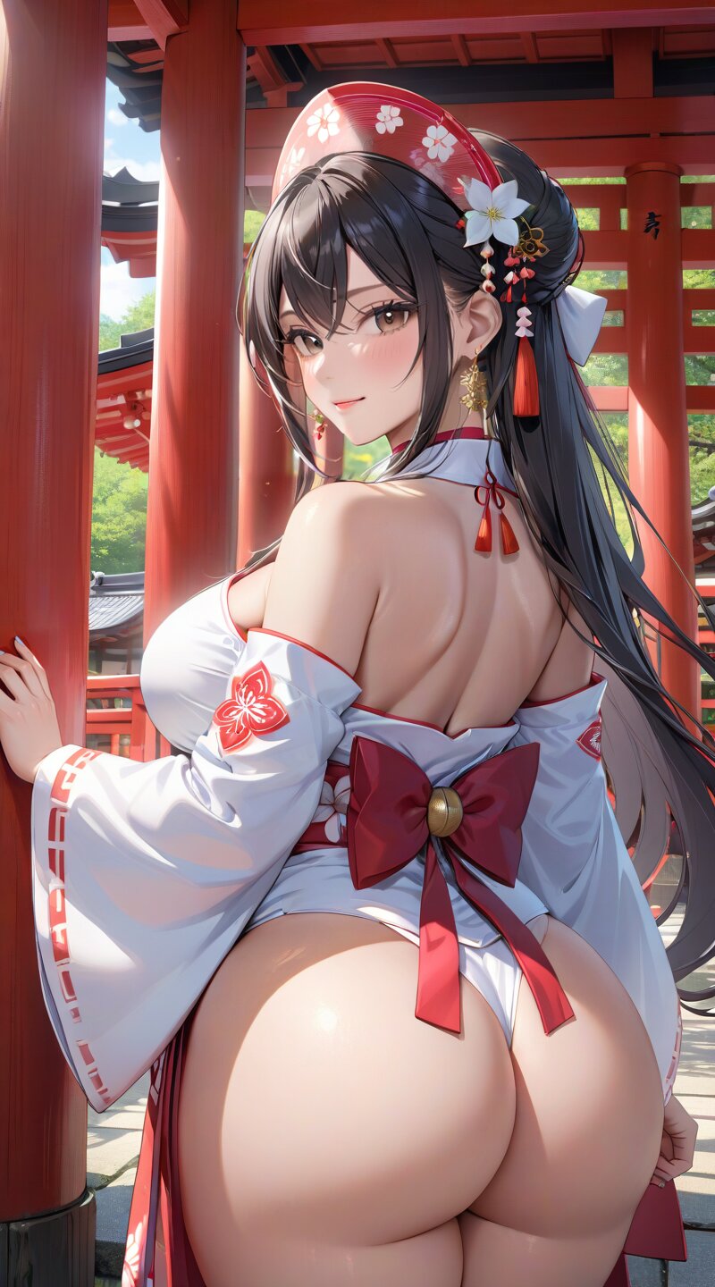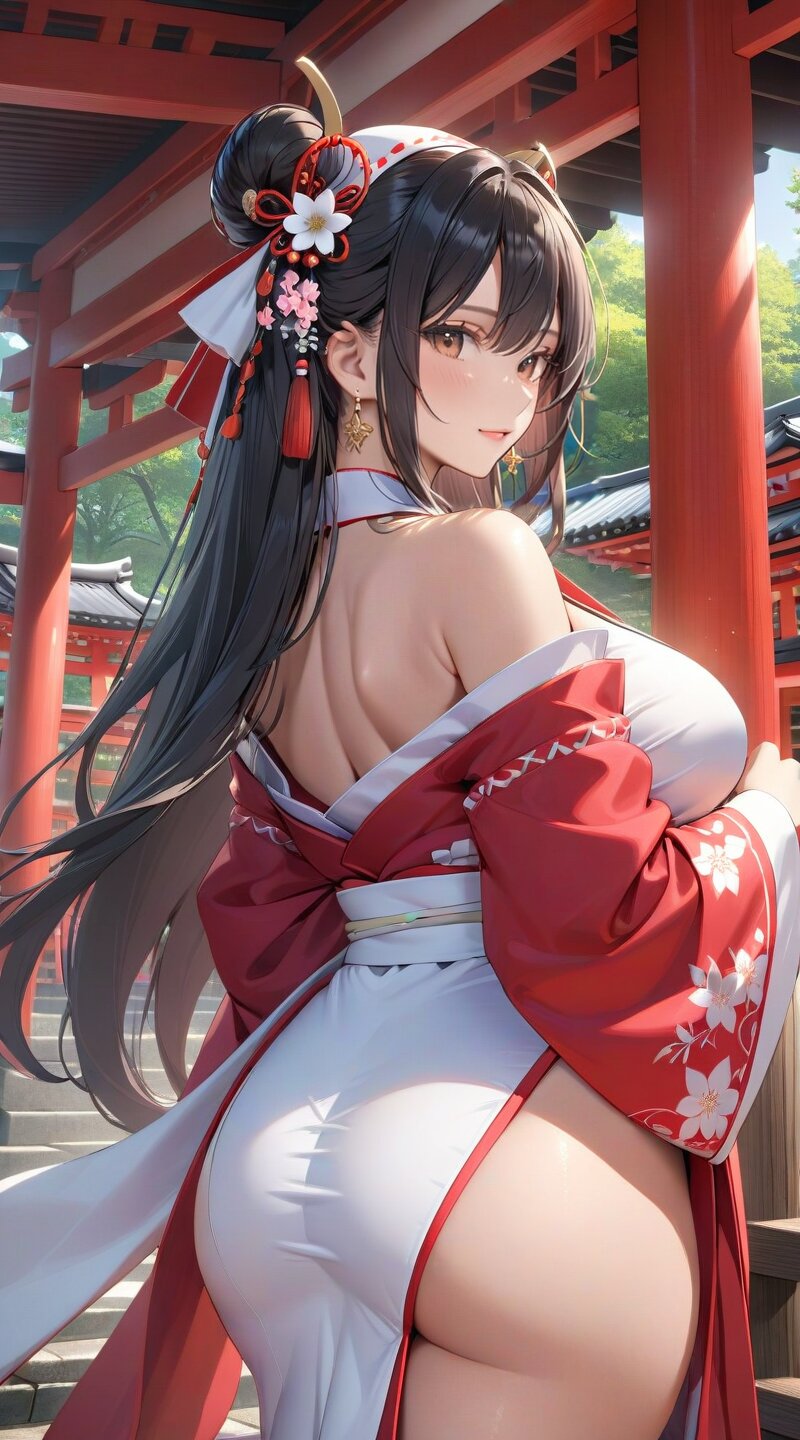 (from back: 1.2), perfect anatomy, (masterpiece:1.3), (best quality:1.3), (ultra-detailed:1.2), 8K, HDR, (incredibly absurdres:1.2), (vibrant color:1.2), 1girl, solo, 22 years old, miko, (perfect body, shrine maiden outfit: 1.6), plump, black wavy long hair, (cowboy shot, sexy posing: 1.8), huge breasts, (an extremely delicate and beautiful hands), nails, beautiful detailed ears, (intricate detail), highly detailed, beautiful detailed eyes, beautiful detailed glow, detailed light, shiny skin, shiny hair, inside of shrine, <lora:fujikoM_v01:1>