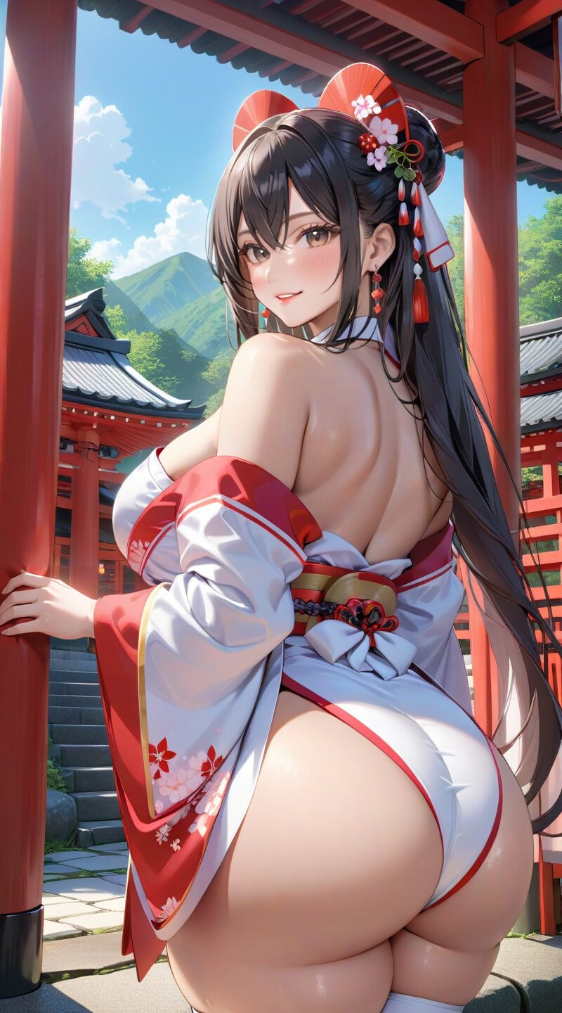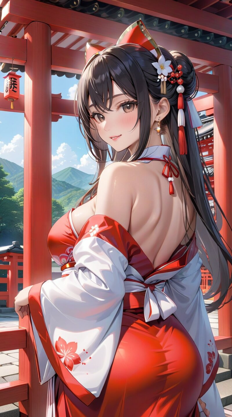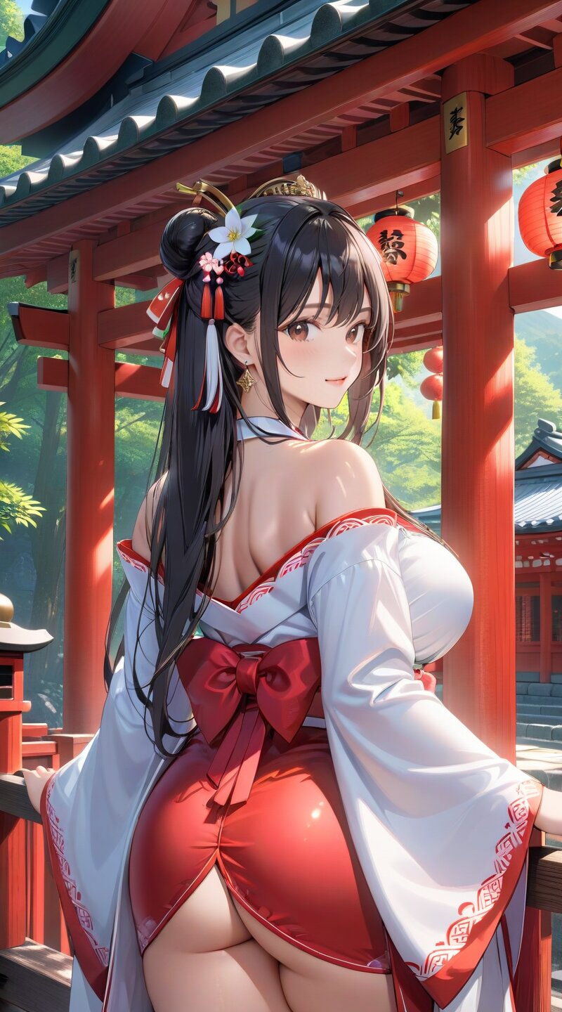 (from back: 1.2), perfect anatomy, (masterpiece:1.3), (best quality:1.3), (ultra-detailed:1.2), 8K, HDR, (incredibly absurdres:1.2), (vibrant color:1.2), 1girl, solo, 22 years old, miko, (perfect body, shrine maiden outfit: 1.6), plump, black wavy long hair, (cowboy shot, sexy posing: 1.8), huge breasts, (an extremely delicate and beautiful hands), nails, beautiful detailed ears, (intricate detail), highly detailed, beautiful detailed eyes, beautiful detailed glow, detailed light, shiny skin, shiny hair, inside of shrine, <lora:fujikoM_v01:1>
