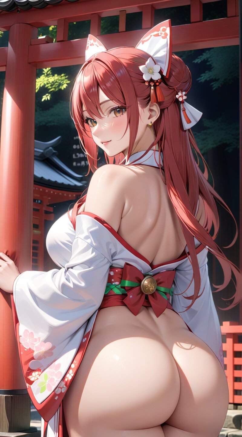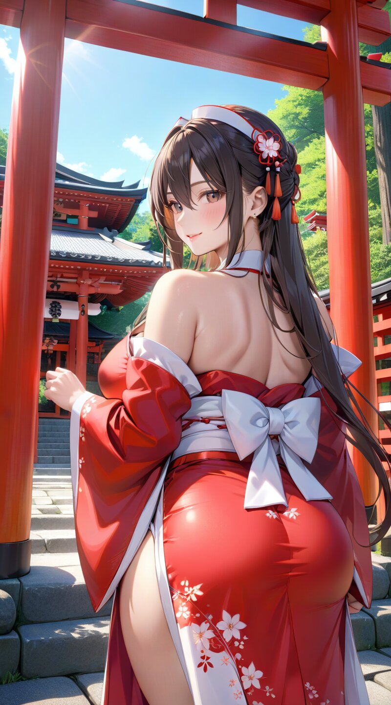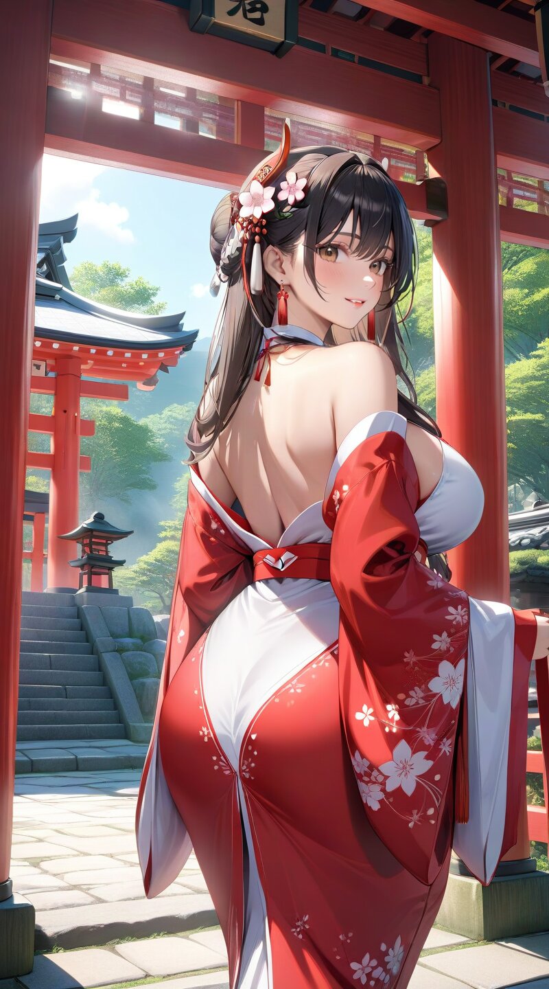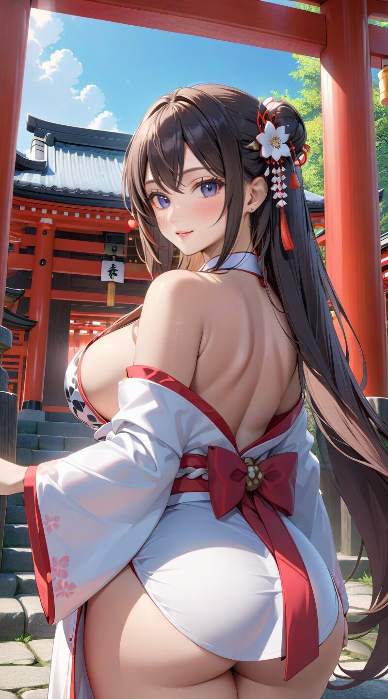 (from back: 1.2), perfect anatomy, (masterpiece:1.3), (best quality:1.3), (ultra-detailed:1.2), 8K, HDR, (incredibly absurdres:1.2), (vibrant color:1.2), 1girl, solo, 22 years old, miko, (perfect body, shrine maiden outfit: 1.6), plump, black wavy long hair, (cowboy shot, sexy posing: 1.8), huge breasts, (an extremely delicate and beautiful hands), nails, beautiful detailed ears, (intricate detail), highly detailed, beautiful detailed eyes, beautiful detailed glow, detailed light, shiny skin, shiny hair, inside of shrine, <lora:fujikoM_v01:1>