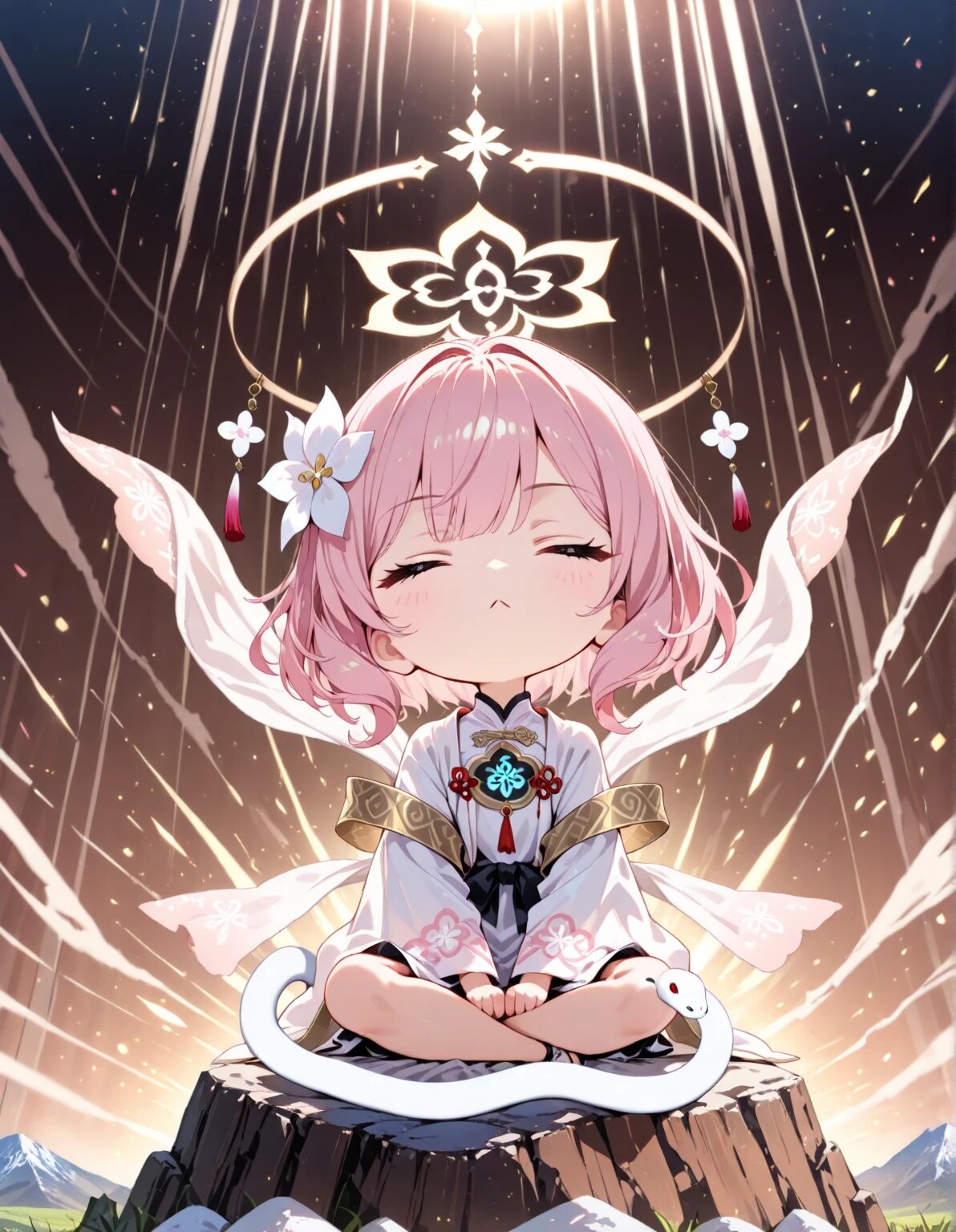 dynamic lighting,(comical and deformed illustration),1girl,solo,indian style sitting on mountain top,(chibi),light pink hair,light pink eyes,loose wavy hair,short bob cut hair,floral hair accessory,closed eyes,:<,(meditating),divine pure white robe,hagoromo,glowing halo, BREAK (little white snake),((masterpiece, best quality, extremely detailed, absurdres)),