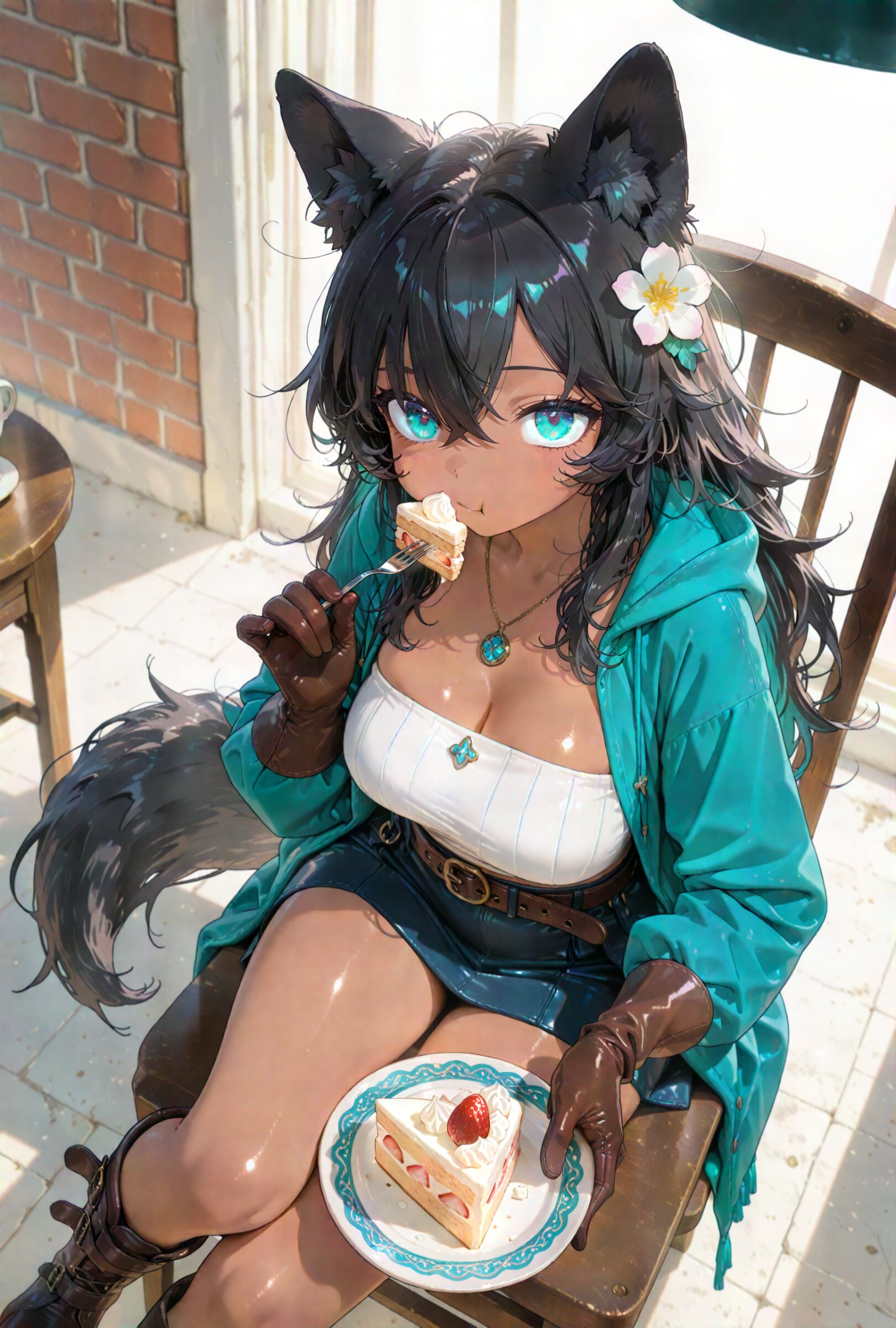 dutch angle, from above, looking up looking at viewer, medieval fantasy world, Brick-style wall, dining table set, pendant light, navy table runner, 1girl, black wolf ears, dark skin, young beautiful girl, large breasts, tall, wolf tail, (aristocratic features), (Black Hair:1.2) (disheveled long hair over ears:1.3) messy hair ornament flower, (perfect turquoise eyes:1.3) long eyelashes,, wearing turquoise hood down and white tube top leather gloves, lether miniskirt, belt boots, turquoise hoodie, eating cake slice, holding fork, sitting dinette chair, table, :t super fine concept art, hard surface, 8K, unreal engine, masterpiece, best quality, amazing quality, very aesthetic, absurdres you can add scenery, (volumetric lighting), To make the background more distinctive. professional art lots of details, , overexposure, shiny-glistening, (watercolor style:0.0), (pastel color style:1.0) <lora:noline (1):-0.5> <lora:sdxl2-flat2-512b:0.0> <lora:facelightup_xl_v10:0.5>