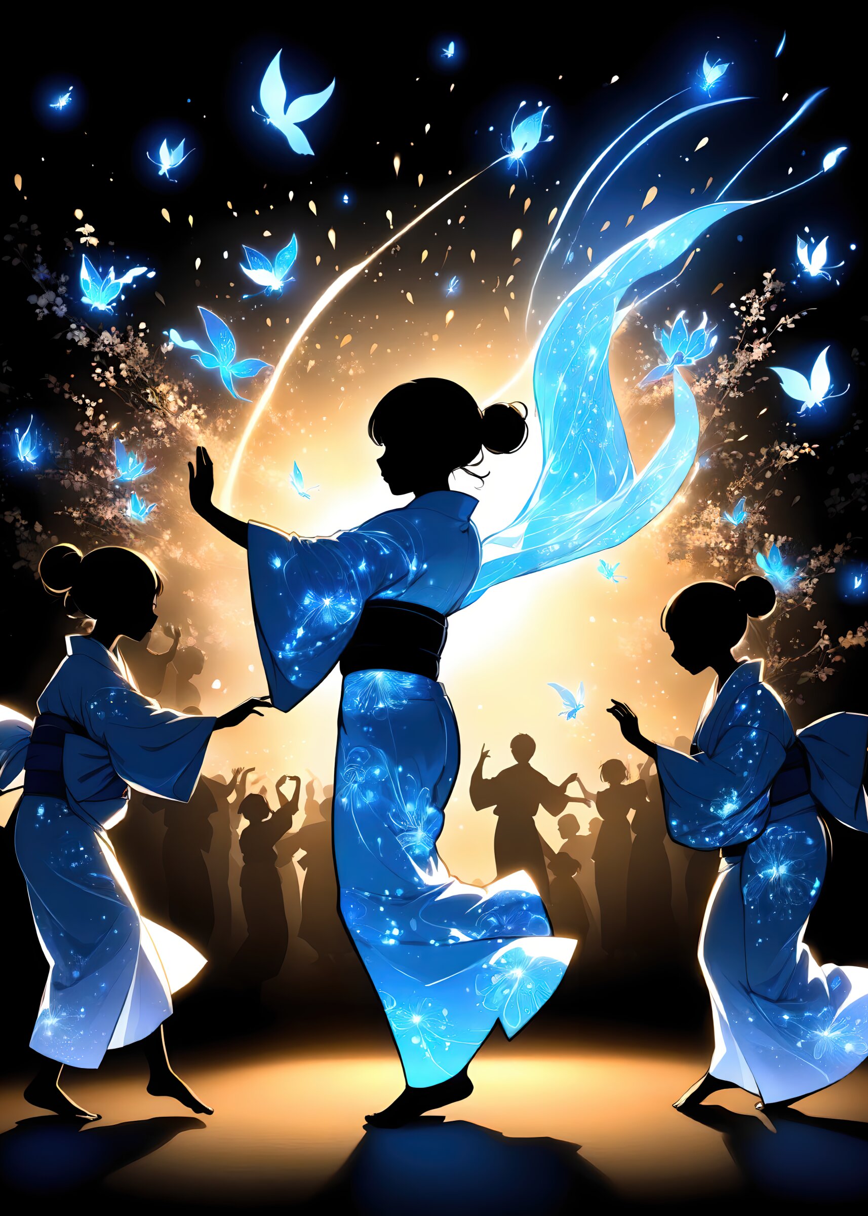 Masterpiece, only the outline glows blue, digital art, silhouette, transparent except for the outline, black background, neon color, Uranobon festival, people dancing around the turret in yukata (light cotton kimono), and the blue spirits shining around them like fireflies, shining blue like fireflies, further surrounding the dancers, silhouette art,