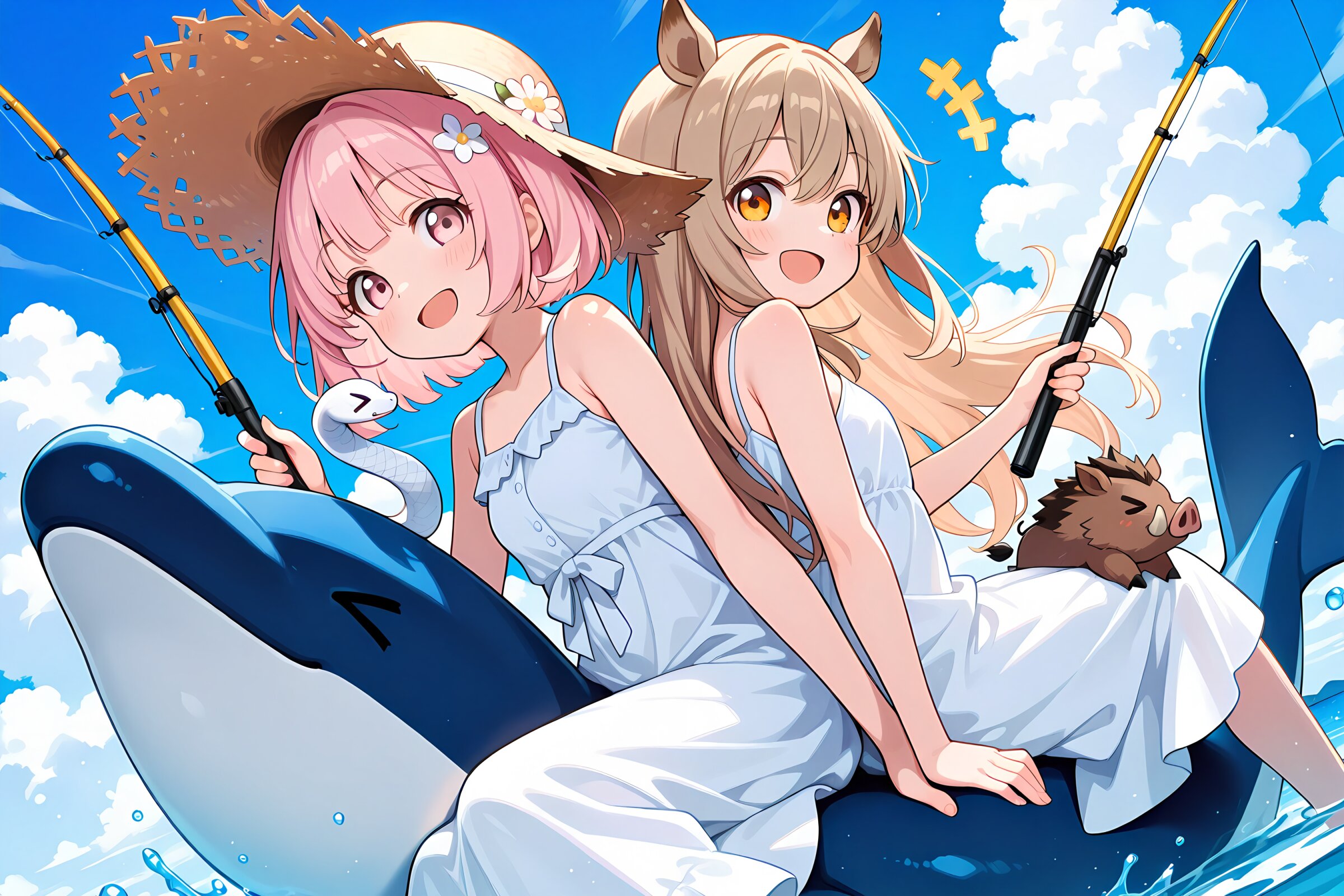 2 little girls, solo, diagonal angle, symmetrical pose, back-to-back, masterpiece, best quality, amazing quality, very aesthetic, light pink hair,light pink eyes, loose wavy hairstyle, short bob cut,floral hair accessory, happy smile, open mouth, cheerful, notice lines, +++, white summer dress, long skirt, straw hat, holding fishing rod, sitting on huge dolphin, (little white snake:1.2), > <, sunshine, cumulonimbus cloud, BREAK 2 little girls, solo, diagonal angle, symmetrical pose, back-to-back, masterpiece, best quality, amazing quality, very aesthetic, light brown hair, long hair, amber eyes, (wild boar's ears:1.2), happy smile, open mouth, cheerful, notice lines, +++, white summer dress, long skirt, (straw hat:1.2), holding fishing rod, sitting on huge dolphin, little wild boar, > <, sunshine, cumulonimbus cloud,